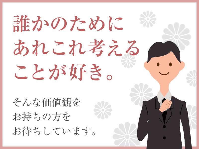 職種/仕事内容 | 仕事内容 「夜勤や残業で体力が限界」 「職場内で周囲との温度差を感じる」 「業務に追われ一人一人に時間を割けない」 など、今の職場で抱えている不安や 悩みはありませんか? 私たちファミーユは、 そんな想いはさせませんので ご安心ください。 ==================== 【01】葬祭ディレクターの仕事とは ==================== ご家族の想いに耳を傾けながら、 故人様の生きた証を残すための 世界にたったひとつのお葬式をつくる、 そんな「お葬式のコーディネート」 をするお仕事です。 <具体的な業務> - 葬儀の打ち合わせ - 式場の手配・接客・受注 - 当日の式進行・運営 日勤のみで夜勤なし。 早朝や夜中に急に呼び出される、 なんてこともありません。 ==================== 【02】ホスピタリティを突き詰められる ==================== 例えば… 画家として活躍されていた故人様のために 式場いっぱいに作品を展示しお葬式を 「最後の個展」のように仕立てたり。 ゴルフが大好きだった故人様のために 花祭壇をゴルフ場に見立てたり。 ご家族のご意向を汲み取り お気持ちに寄り添ったお式にするためなら ご提案できるものに制限はありません! 寂しさと同じほどに 思い出や愛しさも溢れてくる、 そんな心温まるお葬式を これまでも数多く手掛けています。 ― こうしたらもっと喜んでもらえるかも! ― こんなアイデアはどうだろう? そんなホスピタリティ溢れる 想いを実際に行動に移すことや そのために頑張る人を応援する。 ファミーユには、 そんな温かな風土が根付いています。 ==================== 【03】定着率◎異業界からの転職者多数 ==================== 現在活躍中のディレクターのうち 約半数は異業界からの転職者。 また、スタッフもほとんどが中途入社から 活躍してくれている人材です。 \前職も様々/ 介護職やウェディングプランナー、 アパレル販売員、生命保険の営業など 定着率はとても高く 長く活躍される方が多い職場です。 |