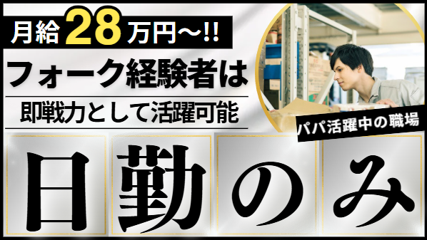 職種/仕事内容 | 仕事内容 \資格を活かして安定収入をGETしませんか?/ ✨必要なのは普通免許だけ! リーチフォークの経験をお持ちの方は大歓迎! ✨日祝休み+長期休暇でプライベートも充実! ✨自分のペースでモクモクと働ける! <お任せするお仕事内容> 300坪程度のエリアにて 入出庫業務をお任せします。 未経験・ブランクがある方も 丁寧にサポートしますので 安心してご応募ください! 何かわからない事があっても 一緒に働いている仲間がすぐに気づいて 助けてくれる環境なので、 きっとあなたもすぐに馴染めますよ☆ \ 若手パパさんにインタビュー! / ――入社のきっかけは? 前職はシフトが不規則で、家庭との両立が難しくなってしまって…。 安定した働き方ができる職場を探していた時に、この仕事に出会いました。 フォークリフトの資格も無駄にせず働ける点に魅力を感じて入社しました。 ――実際に働いてみてどうですか? 倉庫内は整理されていて動きやすく、自分のペースで作業を進められます。 作業内容もシンプルで流れがつかみやすく、 “慌ただしさで追われる”という感覚がないのがいいですね。 同年代のスタッフが多くて、相談も気軽にできる雰囲気があります。 ――働き続けたい理由は?(保育園表現なしで変更) 毎日ほぼ同じリズムで働けるので、生活が安定しました。 夕食の時間に間に合うように帰れることも多く、 家での時間をゆっくり過ごせるようになったのが嬉しいポイントです。 また、評価が分かりやすく、コツコツ取り組んだ分だけ 任される仕事が増えるので、モチベーションにもつながっています。 ――最後に応募者へ一言! 無理なく働けて、家族との時間もちゃんと取れる職場です。 “落ち着いて長く働ける場所を探している”という若手パパさんには 本当におすすめですよ! \ 近隣にも拠点あり / ✓春日部物流センター 埼玉県春日部市豊野町2-11-1 ✓茨城物流センター 茨城県坂東市上出島1217-5 ✓野田物流センター 千葉県野田市はやま22-1 |