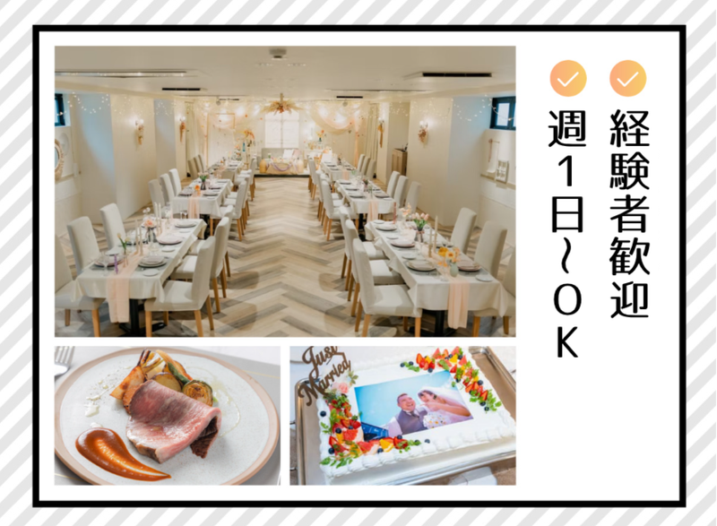 対象となる方 | 求めている人材 ★飲食業界の経験者歓迎! →ジャンルは問わず、過去に飲食店での調理経験がある方は即戦力として活躍ができます! 料理をつくることが好きな方や 誰かの一生の思い出作りに関わりたい方など、 色々な想いを持って働いているスタッフが在籍しています! できる事から始めていきましょう! 仕込みから丁寧にお教えします。 |
