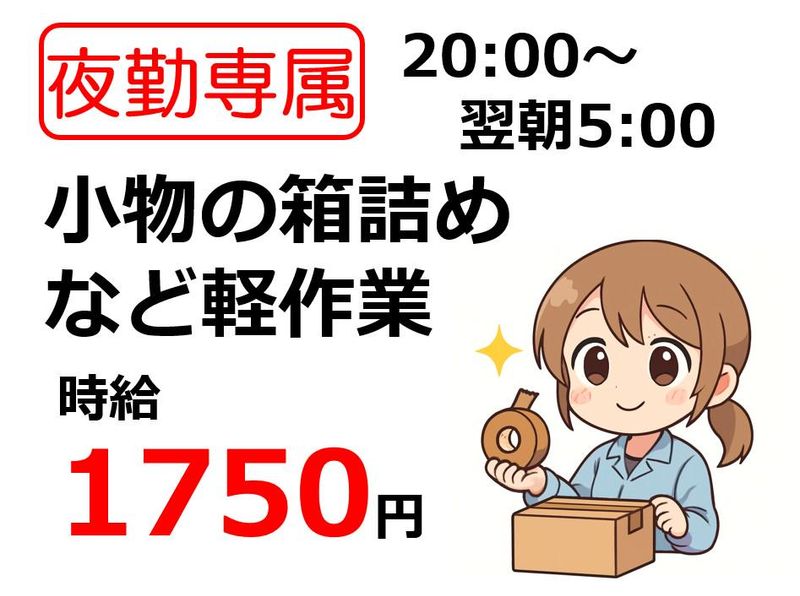 職種/仕事内容 | 仕事内容 夜勤専属のお仕事です 日用品やコスメを 製造している工場でのお仕事です。 作業場は空調完備のクリーンルーム なので、快適かつ清潔な環境◎ 常に一定の温度が保たれているため、 季節に関係なく働きやすいのが特徴です♪ 工場自体も新設されて5年と 新しくキレイです。 お仕事内容 ・容器を組み立て ・ラベルに歪みがないかをチェック ・箱詰め作業 ハンドソープやメイク落としなど 扱う物は軽いものばかりで、 作業自体もカンタン軽作業で とってもオススメです♪ |
