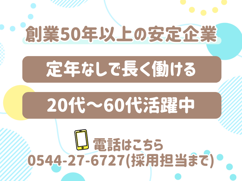 職種/仕事内容 | 仕事内容 土日祝休み&年間休日123日! 未経験から事務デビューを応援します 幅広い年齢層が活躍できる安定企業◎ ――――――――――――――――*。・++ <おしごと内容> 電気設備工事業の当社にて 一般事務業務をお願いします。 ●請求書・支払請求書の作成 ●見積書・安全書類の作成 ●総務業務全般 電話・来客対応、備品管理 ●簡単な清掃や庶務業務 など まずは簡単な仕事からスタート! 未経験の方も丁寧にお教えするので 安心して働けます。 ――――――――――――――――*。・++ <働きやすさの理由> 〇9~17時の実働7時間勤務 〇土日祝休みでプライベートも充実 〇年間休日123日 〇残業ほぼなし 〇賞与年2回(昨年度実績計2.0ヶ月分) 〇安定企業で長く働ける ――――――――――――――――*。・++ <当社について> 創業50年以上の安定企業で 業績も安定しているから 長く安心して働けます。 定年がないので 年齢を気にせず続けられ 20代・30代・40代・50代 60代まで幅広い世代が活躍しています。 ――――――――――――――――*。・++ <応募・受付> 電話 0544-27-6727 採用担当まで ※WEB応募は24時間受付中です ご応募お待ちしております☘ ――――――――――――――――*。・++ |