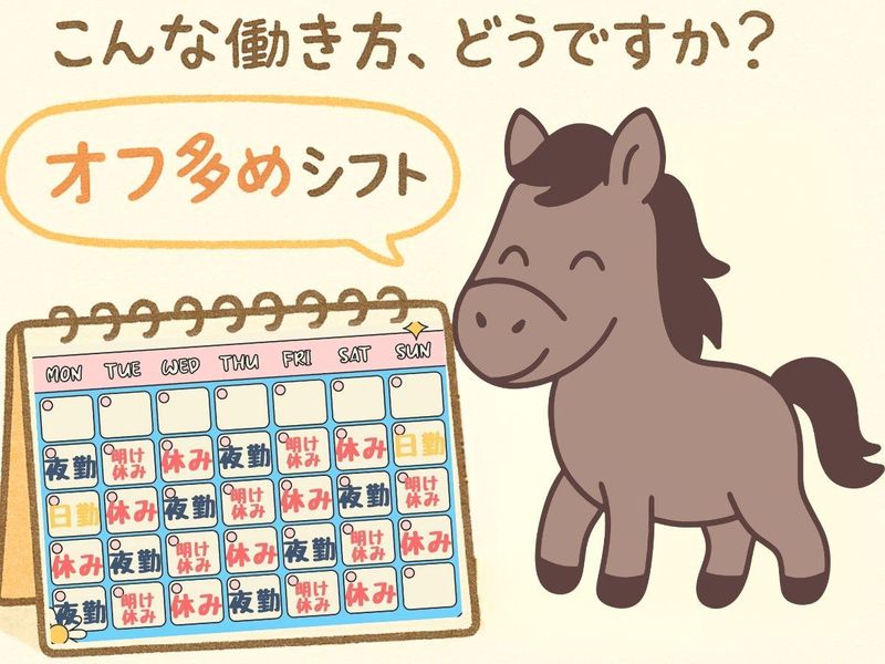 勤務時間 | 変形労働時間制 勤務時間詳細 実働時間:1日あたり7時間 平均勤務日数:1ヶ月あたり21日 〜 22日 (日勤)9:00~17:00 (夜勤)16:30~翌9:00 基本上記シフトによる交代制 シフト例 月曜日 (夜勤) 火曜日 (夜勤あけ) 水曜日 (休み) 木曜日 (夜勤) 金曜日 (夜勤あけ) 土曜日 (休み) 日曜日 (日勤) 上記のように夜勤をベースに勤務スケジュールを組みます。 夜勤勤務時は、仮眠もあるので夜勤明けでお出かけなどしてオフの時間を充実させる事が出来ます♪ |