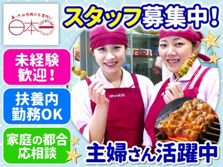 職種/仕事内容 | 仕事内容 店頭で焼鳥や惣菜の販売!接客が初めての方もまずは明るい笑顔で対応できれば大丈夫です♪ お任せするのは… お客様への販売・レジ業務と 簡単な調理補助となります。 お客様のご注文に従って計量し、 タッチパネル式のレジで ご注文の商品を押すだけでお会計は完了! 調理補助では、「焼く」「盛り付ける」 といったカンタンな作業のみ。 下ごしらえは工場で行いますので、 包丁はほぼ使用しません! ●―○-●―○-●―○-●―○-●―○-●―○ 2026年、はじまりの一歩を日本一で。 \\新年と一緒に、新しい仲間を募集中!// ─*。☆*─────────── *賑やかな職場で働きたい! *新しいことにチャレンジしたい! *シフトの融通がきく職場がいい! という方にピッタリ♪ 日本一で、新しい一歩を踏み出しませんか? 人と接するのが好きな方歓迎♪充実のサポート体制ありで始めやすく、続けやすい環境です! 「はじめてのアルバイトで緊張する…」 「社会復帰が久しぶりで不安」 という方でも大丈夫。 スタッフ同士の仲が良く、 いつもにぎやかな職場です。 長期で働くスタッフが 多数在籍しており、定着率も抜群! 自然と会話を交わすことで、 あなたもすぐに打ち解けられると思います♪ 働きやすい環境で長く続けていただけるように充実の待遇をご用意しています! うれしい交通費支給を始め、 夏と冬にはあなたの頑張りに合わせた プチボーナスもあり! ※規定あり 他にも、制服貸与や社員登用制度など、 様々な充実した待遇があります。 従業員割引でお得にお買い物もできるので、 「家計に助かる!」と主婦さんに大好評♪ もう1つの働きやすさはシフトや働き方にあります!自分に合ったスタイルをご相談ください。 シフトは柔軟に対応! 扶養内勤務、Wワーク、フルタイムなど 働き方は希望をお聞かせください! 学歴や年齢は問いません! 応募に必要な資格・経験は一切ないので、 すぐにチャレンジできますよ! 未経験の方でも先輩がしっかり フォローしますので安心してくださいね。 1981年創業。百貨店、ショッピングセンターを軸に、全国各地に出店することを目標にしています。 生産業者に対するダイレクトな食材発注、 徹底した品質管理、迅速な物流ラインを実現。 それによって安全な商品の提供をしてきました。 常に新しい食の提案を推進しています。 |