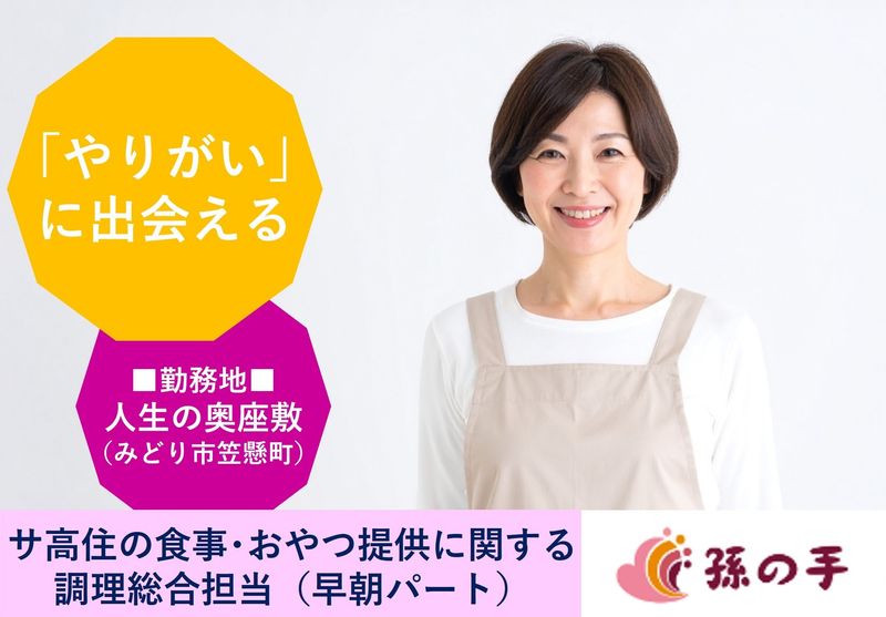 職種/仕事内容 | 仕事内容 【早朝パート】【経験者】【シフト勤務】 サ高住の調理員(早朝パート)新規募集 <主な仕事内容> サービス付き高齢者住宅の食事とおやつ提供に関する調理総合担当 ・メイン調理業務 ・配膳 ・下膳 ・食器洗浄 ・清掃 ・その他上記に付帯する業務 *食数は朝50食、昼100食、夕50食程度です。 *変更範囲:会社の定める業務 <【必須】資格・経験・スキル> ・介護施設での調理経験 <【歓迎】資格・経験・スキル> ・調理師 ・栄養士 ・管理栄養士 あれば尚可 <勤務地> サービス付高齢者住宅 人生の奥座敷 孫の手 群馬県みどり市笠懸町久宮164-1 JR両毛線「岩宿」駅より車で7分 太田藪塚ICより車で10分 東邦病院バス停より車で10分 *職場見学OK *マイカー通勤可 *駐車場完備 <サービス付き高齢者向け住宅とは> サービス付き高齢者向け住宅とは、 バリアフリー構造・一定の設備を備え、 介護や医療などの支援が必要な方を対象とし ケア専門家による安否確認や生活相談と言った 見守りサービスを提供する住宅のことです。 <1日の流れ>(例) (6:00~7:00)起床 (7:30)朝食 (8:00~8:30)口腔ケア ※デイサービスに行かれない方 (8:30~9:30)居室やリビングでゆっくりくつろぐ (9:30)訪問サービス (12:00)昼食 (13:00)訪問サービス (14:00)入浴 (15:00)おやつ (16:00~16:30)居室やリビングでゆっくりくつろぐ (18:00)夕食 (19:00)就寝準備 (20:00)就寝 <働き方はご相談下さい!> 家庭環境などに応じた柔軟な職制制度を設けております。 お子さんの学校行事に配慮します。 小さなお子さんがいても安心して働けます。 *育児休業取得率100% |