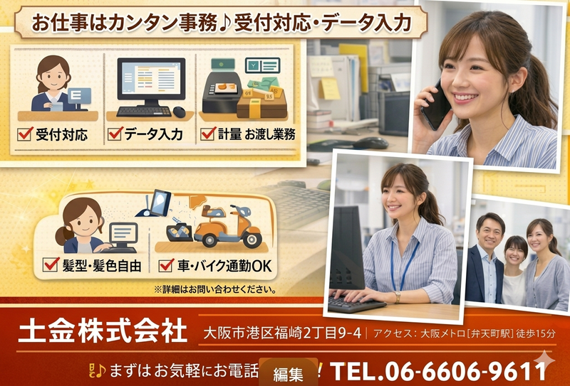 職種/仕事内容 | 仕事内容 ✅高収入:月給25万円~28万円スタート ✅残業ほぼなし/希望に応じ1hの残業も可 ✅完全週休2日制(日曜+希望曜日) ✅年間休日120日 ✅基本的なスマホ操作ができればOK ✅土曜・祝日出勤時はお弁当支給 ✅簡単なPCスキルを身に着けたい方歓迎 ✅学歴不問・経験不問・ブランク不問 ✅履歴書不要のカンタン面接 「株式会社土金」とは  ̄ ̄V ̄ ̄ ̄ ̄ ̄ ̄ ̄ ̄ ̄ ̄ ̄ ̄ ̄ ̄ ̄ 大阪市港区に拠点を置く、 金属スクラップの収集・運搬・買取を 行っている企業です。 「スクラップ買取事業」ってなに?  ̄ ̄V ̄ ̄ ̄ ̄ ̄ ̄ ̄ ̄ ̄ ̄ ̄ ̄ ̄ ̄ ̄ 「スクラップ」って、ゴミ? いいえ、実は大切な“地上の資源”。 環境にも社会にもやさしい、 未来につながるリサイクル事業で 安定性・将来性ともに抜群◎ 都市部の再開発やインフラ更新に伴い、 産業廃棄物や金属スクラップの発生量は 今後も増加傾向! これにより、弊社の需要も拡大見込み! どんな仕事をするの??  ̄ ̄V ̄ ̄ ̄ ̄ ̄ ̄ ̄ ̄ ̄ ̄ ̄ ̄ ̄ ̄ ̄ 搬入されたスクラップ(金属など) を買い取る際の、受付・データ入力の お仕事をお願いします! ⭐専門的な知識は一切不要! ⭐スマホ操作ができればOK <具体的には…> ・スクラップの受け入れ対応 (お客様のご案内や、身分証のコピーなど) ・金属の相場確認 (他社の価格をチェック・LINEで共有) ・買取業務 (計量、買取額(現金)のお渡しなど) ・重量や個数の記録入力 (数値を打ち込むだけ) 重機が動くダイナミックな現場を、 事務所からちょっとのぞける。 そんな非日常感も楽しめる職場ですよ。 ⭐WordやExcelの知識不問 入力作業は簡単な文字入力ができればOK! ゆっくりタイピングができれば問題なし◎ 優しい先輩スタッフが隣で 親身に教えてくれるので、 安心してスタートできます。 一般事務などの経験がない方も 始めやすいお仕事ですよ。 魅力満載の職場環境✨  ̄ ̄V ̄ ̄ ̄ ̄ ̄ ̄ ̄ ̄ ̄ ̄ ̄ ̄ ̄ ̄ ̄ <先輩スタッフについて> 現在働いているのは20代の女性スタッフが 2名と30代の男性スタッフ1名。 みんな優しくて、世間話をしながらも、 仕事になるとテキパキとこなす 頼れるメンバーばかり♪ <社風について> 地域密着型(転勤なし)で、 シフトの柔軟性やスタッフ同士の 話しやすい雰囲気が魅力♪ また、「やればやるほど評価される」 職場なので、頑張りがしっかりお給料に 反映されるのも嬉しいポイント。 モチベーションを持って働ける環境です。 |