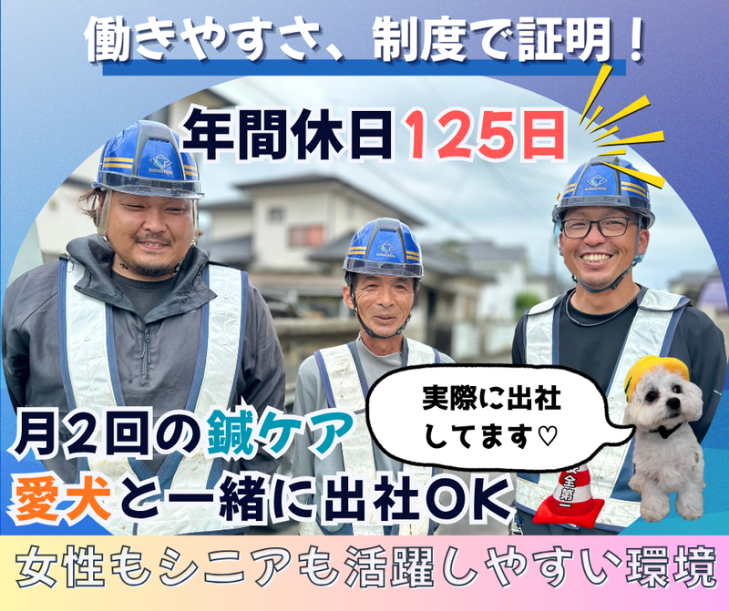 対象となる方 | 求めている人材 ●年齢・学歴不問 <必須資格> 2級土木施工管理技士 2級管工事施工管理技士 普通自動車運転免許必須 <歓迎するスキルや経験> *車両系建機技能講習修了 *小型移動式クレーン運転技能講習修了 *建設機械施工管理技士 *1級土木施工管理技士 *1級管工事施工管理技士 <人材育成・スキルアップ支援> - 業務終了後には毎回30〜60分の勉強会を開催し、全員で知識・技術の向上に取り組んでいます。 - 雨天時など現場作業ができない日も、学習や振り返りの時間として活用でき、継続的なスキルアップが可能です。 - 国家資格を取得した社員には資格手当を支給し、努力がしっかりと還元される体制です。 - 働きながら専門性を高め、着実にキャリアアップできる環境を整えています。 |