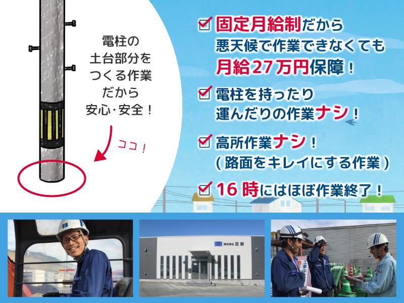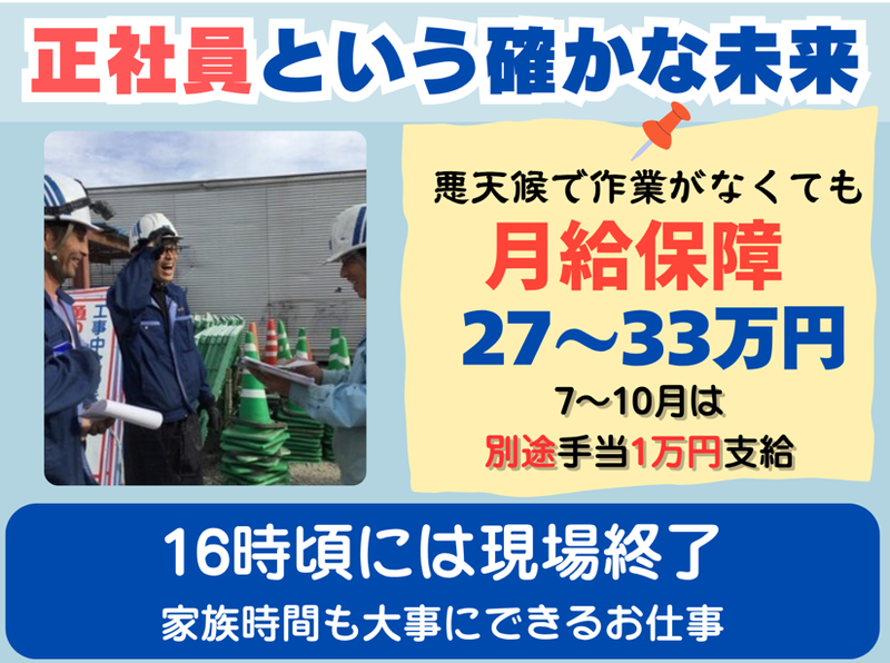 職種/仕事内容 | 仕事内容 【お仕事のこと】 九州電力からの依頼の元、鉄塔を立てる際の土台の工事や電柱建て替えの際の路面補修工事を行います。 あくまでも土台作りの土木工事の作業なので、電柱を建てる作業や高所作業・電気工事はありませんのでご安心下さい。 大がかりな現場もありますが、2~3名で短時間で終わる現場もあります。 また、街の中もあれば自然豊かな田舎の気持ちいい環境での作業もあり、飽きずに働けますよ。 【暑さ対策もバッチリ】 7月~10月はジュース代として お給料とは別に1万円支給 会社からも水分・塩分補給ジェル飲料の 支給や空調服ももちろん全員に支給。 暑い時期は休憩も多めにとって頂いたり 応急処置マニュアルなども徹底しています ので安心して作業に取り組むことが できる環境です。 【未経験から正社員として安定をつかもう】 屋外での作業って、天候に左右されてお給料も変動しがちですが、正社員としての採用、しかも月給制ですのでその心配はありません。 悪天候で作業が出来なくても月給はきちんと保障しますので安心です。 【将来的にどうしたいかは自分で決められる】 ずっと作業員として活躍するのも もちろんOKですが、色んな資格を取って 活躍するのも応援します。 もちろん資格取得は会社全額負担。 【スタッフコメント】********** ここで長く働き続けられている 理由はいろいろありますが、 やっぱり一番は社長の人柄です。 いつもニコニコしていて、 とてもフレンドリー。 ちょっとしたことでも気軽に 「社長、社長~」と声をかけられる 雰囲気があって、作業員みんなが 自然と慕っています。 現場のこともよく見てくれていて、 相談もしやすい。 そんな気さくで親しみやすい社長が いるからこそ、安心して働ける 環境があるんだと思います。 この機会に、一生ものの「手に職」を 身につけるのもおすすめです。 当社では、業績がしっかり給与に 反映される仕組みが整っているので、 頑張った分だけしっかり評価されるので やりがいもここで見つけました。 |
