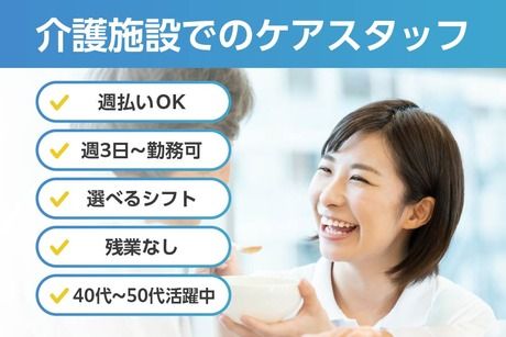 職種/仕事内容 | 仕事内容 【業務内容】 ケア施設にて、ご利用者様が快適に過ごすためのお手伝いをしていただきます。 業務内容は、、 ・日常生活支援(お食事、お手洗い、ご入浴のお手伝い) ・レクリエーションの企画、準備、実行 ・実績、請求などの事務作業 ・ご家族、ケアマネージャーとの相談業務 など 【お仕事スケジュール例】※勤務の一例になります 09:00~10:00 送迎、健康チェック 10:00~12:00 入浴準備、サポート 12:00~13:00 昼食介助 13:00~14:00 休憩 14:00~15:00 レクリエーション 15:00~16:00 おやつ 16:00~17:00 送迎 17:00~18:00 後片付け、翌日の準備 お仕事終了 小さいお子様がいても安心!20~50代の主婦/主夫さんも活躍中 日勤のみ/土日祝日休み/週3日~ 来社不要。LINEでお仕事紹介できるのでらくらく♪ |