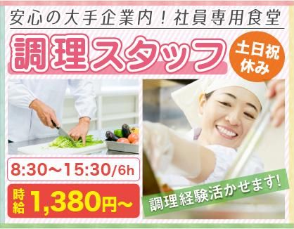 職種/仕事内容 | 仕事内容 \働く方に楽しい食事を/ 安心の大手企業内!社員専用食堂♪ 【勤務地】通勤も楽々♪ ◆東急各線/二子玉川駅歩2分 (世田谷区玉川二丁目) ★★同条件で下記も募集★★ 東急各線/三軒茶屋駅近く♪ ◎調理スタッフさん募集! (調理経験等活かせます) <ここもポイント♪> 1日30~40食程度の調理! ★★定食1種類のみ★★ 【具体的には】 ・献立表に沿った昼食等の調理 (日替わり定食1種類) ・仕込み、盛付け、提供 ・簡単な事務作業など 【勤務時間・曜日】 8:30~15:30/休1h・実6h ★月~金曜/週5日(祝休み) ◆ゆとりの勤務も人気! (月収/18万2160円以上可) 【休日・休暇】 完全週休2日制(土・日・祝) GW・年末年始・他企業カレンダー ★年間休日120日以上でオフも充実♪ (お子様のいらっしゃる方にも大好評) 【社員食堂で働くメリット】 ✅働き易く安定した勤務時間♪ 社員食堂は企業の営業時間等に合わせて運営されており、中でも平日のランチタイムが中心です♪ ✅お客様は常連(社員やスタッフさん等) 社員食堂のお客様はその企業で働く社員やスタッフさんがほとんどなので、とてもアットホームな環境です♪笑顔いっぱいの「美味しかったよ~」「ごちそうさま」も大きなやりがいです♪ ✅嬉しい食事補助(美味しい賄い)♪ 昼食代節約&お弁当の手間も不要♪ ✅ご家庭での調理にも役立つスキル 調理方法や衛生管理の知識もゲット! ✅他、飲食業等とは異なる休日♪ 各企業等の休日と合わせる社員食堂がほとんどなので、土・日・祝日やGW・年末年始休暇もあるのが特徴です。 【当社概要】 ・企業事業所給食/首都圏約200店舗! ・ISO14001取得 |