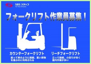 職種/仕事内容 | 仕事内容 フォーク作業/注目案件/今週新着のご案内 平日5日の勤務(土日・祝日休み)でスケジュール立てやすいお仕事先 通勤は、八幡宿駅から徒歩で30分程度の場所♪ バイク・自転車通勤もOK! フォーク(リーチ・カウンター両方)をお使いいただき、サッシやその部品などの入出庫作業をお願いします。 部材が基本建築資材のため、重量は30キロ~50キロ程度の重量物となります。 作業自体は、難しくはありませんが、フォーク乗務経験者を募集します。 手作業での検品作業などをお願いする場合がありますので、1日の割合としては、フォーク作業7割、手作業3割という形でお願いするかと思います。 固定で、フォーク作業を希望されている方におススメをしたいお仕事先となります。 ・休憩室完備/冷蔵庫・電子レンジ・湯沸し器完備 ※お弁当を温めてお食べをいただけます。 ・個人ロッカー完備 ※制服貸与あり ・洗面所、男女別完備 ・駐輪場完備 ・館内原則禁煙(喫煙スペースあり) その他 ※残業ある場合、1日平均で30分程度 ※有給休暇取得しやすい ※事前の休み調整可能 ※男性活躍のお仕事先 ※雇用保険・社会保険完備 ※有給休暇取得あり ※交通費実費分支給★バイク通勤の方には、ガソリン代実費分支給 [こんな人が活躍] 黙々と出来る方が活躍中! |
