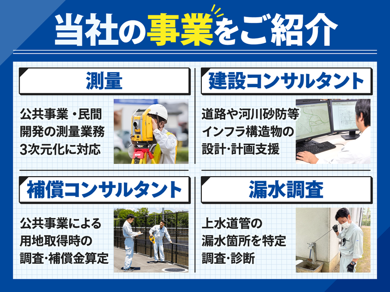 職種/仕事内容 | 仕事内容 \創業50年以上*官民問わず受注数安定/ 「とみそく」で親しまれる地元密着企業 ~長期で安定して働きたい方も必見です~ 【残業少なめ】月平均残業15時間程度 【基本土日祝休み】年間休日115日 【スキルUP】資格取得支援&研修制度充実 -------------------- 【具体的な仕事内容】 ・官公庁への補償コンサルティング ・現地調査で、対象の⼟地や建物の 調査・計測 ・調査結果をもとに、 積算ソフト(Excel)で補償⾦額の算定 ・CADによる建築図⾯の作成 ・近隣住⺠等に対する説明業務 ※デスクワークが8割。 納期に合わせて自分のペースで 仕事を進められます! ※現地調査は、複数人のチームで行います。 ※打合せや現場調査等に社用車を使用 \更なるスキルUPを会社が全力応援/  ̄ ̄ ̄ ̄ ̄ ̄ ̄ ̄ ̄ ̄ ̄ ̄ ̄ ̄ ̄ ̄ ̄ 〇業界団体主催の研修会に無料で参加可能! 〇資格取得費用は合格時に全額支給! 〇報奨金や資格手当支給で月給+αの収入! \社員全員が働きやすい環境へ・・・/  ̄ ̄ ̄ ̄ ̄ ̄ ̄ ̄ ̄ ̄ ̄ ̄ ̄ ̄ ̄ ̄ ̄ 土木・建築の知識や法律はもちろん、 コミュニケーション能力や 理論的思考なども大事にしている当社。 「居心地がよい」「アットホームな雰囲気」 とみなさん口をそろえて言ってくれます。 そんな背景にあるのは・・・ 円滑に業務を進められるようにと、 相手を気遣う行動が社内に溢れているから。 「和気あいあいと、楽しい職場で働きたい」 そんな方には特にオススメしたい環境です! -------------------- 【富岡測量設計について】 "愛称は「とみそく」" 1969年、測量会社として設立。 その後、建設・補償コンサルタント、 水道インフラに関する漏水調査などに 事業の幅を広げてまいりました。 群馬県内の土木行政に携わり、 県民の皆さまの快適で安全な暮らしを 支える役割を担っています。 =会社HPはこちらをチェック= https://www.tomiokasokuryo.co.jp/ |