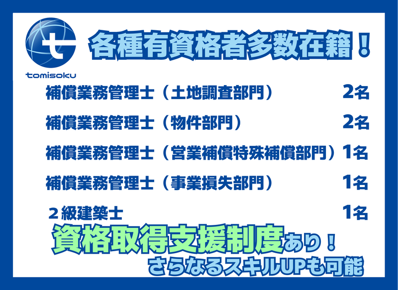 対象となる方 | 求めている人材 \ 向上心のある方、求む! / 資格取得や研修参加で個人の成長を応援! まちの未来を創る仕事に挑戦しませんか? 《必須》 ・補償業務の実務経験1年以上の方 ・普通自動車運転免許 ・高卒以上 【求める人物像】 ・細かい作業が得意、忍耐力がある ・柔軟性をもって業務に対応できる ・コミュニケーションを大切にできる方 ・資格取得にも意欲的に取り組める方 土木・建築科目を履修された方や、 建築CAD、Excelスキルをお持ちの方、 測量・建設コンサルタントの経験者、 補償業務の経験者・有資格者など歓迎! 年齢の条件と理由:あり(例外事由1号・60歳未満(定年のため)) |