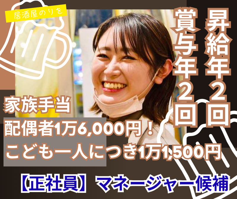 職種/仕事内容 | 仕事内容 【お仕事内容】 早期にマネージャーとして活躍頂こうと考えています! 数店舗の店舗運営全般とアルバイト、パートの勤怠管理なども大切なお仕事! あなたの能力を十分に発揮して頂けるステージが有ります! 1)マネージャーとして、店舗運営全般をお任せします。 2)マネージャーとして、スタッフ管理もお願いします。 3)食材などの仕入れの発注方法などもお任せしていきます。 4)店長の良きサポーターとして、さらなる繁盛店を目指していきます。 あなたの能力を十分に発揮して頂けるステージが有ります! 【アピールポイント】 入社祝金5万円支給(規定有) 幹部候補スタッフを迎えるに当たって、充実した待遇をご用意してます! さらにお給料を月給35万円スタートにし、最高額を50万円に増額しました! 配偶者も喜ぶ少し変わったお米10kg支給有り! ・まずは、安定した月給であなたをスカウトします! 頑張りも収入で還元!目標達成制度有! シフト制で月間6日のお休み! 月間8日のお休みか10日のお休み選択もOK! 【新コンセプトで登場したお店】 おかげ様で連日大盛況! なので、店舗運営スタッフを大募集!! スタッフのみなさんが、仕事とプライベートを上手く調整できるように 増員募集でみなさんのシフトを柔軟に対応中! 「稼げる!」「楽しく!」「自分の働きやすい時間で!」 スタッフみんなが、働きやすい環境を整え中です! 【仲間って?】 業界経験者さんやフリーターから正社員を目指したい方! アルバイトスタッフには学業と上手く両立しながら、 バイトをする男子学生や女子学生さん! 時間を有効活用しながら家計の足しにしている主婦さん! 趣味の時間を作りながら、ガッツリ稼ぐフリーターさん! 20~30代の男女スタッフたちが活躍中の楽しいお店です! 【会社概要】 株式会社ケイビーフーズ 創業/2006年 資本金/3,000万円 従業員数/397名(アルバイト・パート含む) 事業内容/各種飲食店の経営・各種飲食店の運営業務請負 ホームページ/https://kbgroup.jp/ |