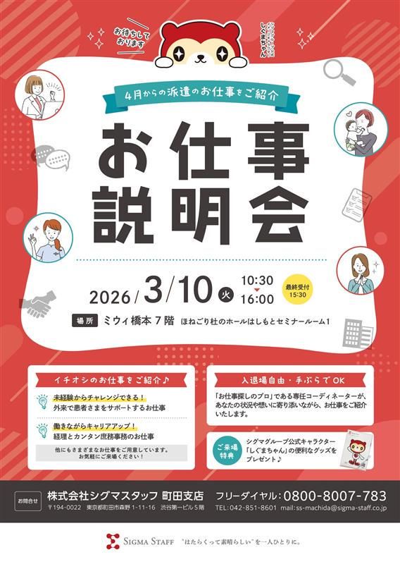 職種/仕事内容 | 仕事内容 ・✦✨ 週3日▶扶養内で働ける ✨✦・ ✅期間限定の短期!2026年3月末まで ✅日勤専属&病院内で快適勤務 ✅保育士資格があれば実務未経験でもOK ✅子育て経験も活かせるお仕事♪ ⊹・ ┈┈┈┈┈┈ ・⊹ ・ ┈┈┈┈┈┈ ・⊹ 病院内の託児所で無理なく勤務! お子さんたち1人ひとりと しっかり向き合える少人数制の職場です♪ ⏩乳幼児の保育 ⏩身の回りの準備/片付け/清掃 ⏩食事の配膳準備/片付け ⏩お昼寝チェック ⏩行事、製作の準備の補助 ⏩その他保育士業務 期間:2026年3月末まで ※延長の可能性あり! ⊹・ ┈┈┈┈┈┈ ・⊹ ・ ┈┈┈┈┈┈ ・⊹ ₊⁺⭐保育士資格が活かせます♪⭐₊⁺ 保育士の資格必須!即日勤務OK♪ 「資格はあるけど実務経験がない」 「ブランクがある」「扶養内で働きたい」 そんな方のご応募も大歓迎です!! 先輩スタッフがしっかりサポートするので 安心して勤務できます♪ もちろんご自身のお子さんの体調不良や 園内・学校行事、面談など ご家族の都合を優先した働き方もOKです! ⊹・ ┈┈┈┈┈┈ ・⊹ ・ ┈┈┈┈┈┈ ・⊹ ✅安定感◎病院内の託児所勤務♪ ✅通勤ラクラク!無料シャトルバスあり★ 車通勤もOKです! ⊹・ ┈┈┈┈┈┈ ・⊹ ・ ┈┈┈┈┈┈ ・⊹ お仕事説明会 @ミウィ橋本7階ほねごり杜の ホールはしもとを開催します♪ *日時: 2026年3月10日(火) 10:30~16:00(最終受付15:30) *場所:ミウィ橋本7階 ほねごり杜のホールはしもと セミナールーム1 予約不要!入場無料!! ご来場の方へ オリジナルグッズをプレゼント★ 聞いてみたかった疑問や質問に 何でもご相談のります♪ お買い物ついでに ぜひお気軽にお立ち寄りください! |