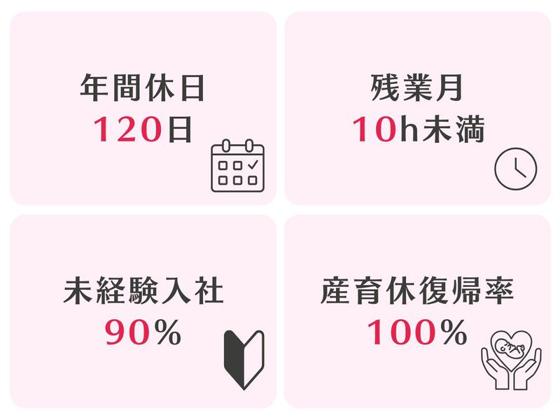 職場環境・雰囲気 | 職場環境 「やってみたい!」という気持ちを 私たちは大切にしています。 未経験者への研修制度やフォロー体制も 整っているのでご安心ください♪ 喫煙所:なし(敷地内全て禁煙) |