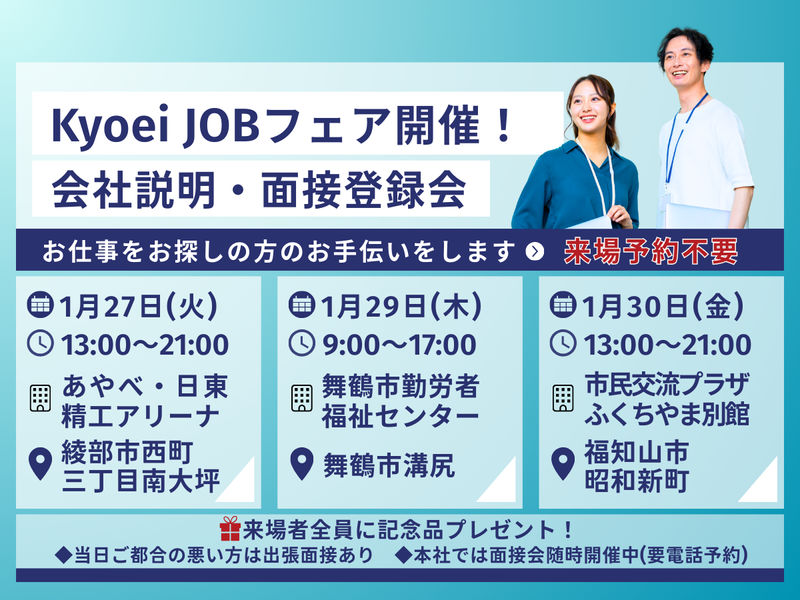 職種/仕事内容 | 仕事内容 / 電子部品の製造オペレーター 男女ともに活躍中(*˘︶˘*)⭐ \ 【お仕事内容】 実装機・検査機・調整機を操作して、 基板に電子部品を 搭載・検査・調整するお仕事です。 ※立ち仕事となります。 【おすすめポイント】 ・男女ともに活躍できる職場 ・未経験でもマンツーマンで丁寧に指導 ・年間休日130日!プライベートも充実 *.˚・・・・・・・・・・・・・・・・・・・・・・・・・˚.* 「正社員として働くか迷っている」 「職場の雰囲気が気になる」という方も、 まずはお話を聞きに来てみませんか? お電話での応募も大歓迎✨ ☎:0773-45-3260(採用担当宛) ご応募お待ちしております! *.˚・・・・・・・・・・・・・・・・・・・・・・・・・˚.* ╭────── · · ୨୧ · · ──────╮ 協栄設備サービス株式会社 会社説明&面接登録会 定期開催中! ╰────── · · ୨୧ · · ──────╯ *˖*✧*協栄設備サービスの強み*˖✧*˖ ・経験や希望に合わせた仕事探しをサポート ・就業後のキャリアアップやお悩み相談も完全バックアップ ・地域密着で地元企業とのつながり多数 ・定年まで安定して働ける環境 ・休日・休暇が取りやすい ・。・*・。・*・。・*・。・*・。・・。・*・。・*・。 【2026年1月スケジュール~】 ⭐1/27(火)13:00~21:00 あやべ・日東精工アリーナ 会議室2 綾部市西町三丁目南大坪39番地10 ⭐1/29(木) 9:00~17:00 舞鶴市勤労者福祉センター2F 洋室1 舞鶴市溝尻150-11 ⭐1/30(金)13:00~21:00 市民交流プラザふくちやま別館 第3会議室 福知山市昭和新町105 ※予約不要お気軽にご来場ください ・来場者全員に記念品をプレゼント! ・当日ご都合の悪い方は出張面接致します ・本社にて面接会随時開催中(要電話予約) |