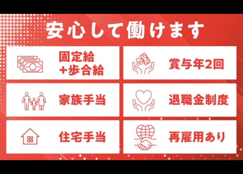 対象となる方 | 求めている人材 【年齢・経験不問/40歳以下面接確約】 <必須条件> ◆高卒以上 ◆要普免(AT限定可) ◆人と接することが好きな方 <歓迎条件> ・明るく元気な対応ができる方 ・きちんと挨拶ができ礼儀を大切にできる方 ・コミュニケーション力のある方 異業種から転職した先輩が多数活躍中! 未経験の方も安心してスタートできます! |