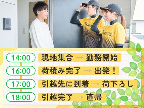職種/仕事内容 | 仕事内容 ━━━*\ バイトデビューにピッタリ! /*━━━ お客様のご家財を2~5名のチームで運びます。 はじめは軽い段ボールを運んだり、 建物内の養生(ブルーシートを貼る)など、 カンタンな軽作業からスタート。 重いご家財については複数名で運ぶので、 未経験の方も安心ですよ◎ ━━━*\ 好きな時に働ける /*━━━ 「明日、ヒマかもしれない」 「お財布がいつの間にかピンチ!」 「たまには贅沢飯が食べたい!」 そんな時は迷わずスマホでシフト申請! 【前日12時まで】受け付けています。 週1・月に数回・ヒマな時だけ、 あるいは目標額が貯まるまで等々 あなたの働き方でOKです! ━━━*\ 未経験の方でも安心な充実した研修あり◎ /*━━━ 初日は自社の研修施設にて、 仕事の流れや実際の仕事イメージをつかむためのレクチャーを 2時間ほど受けていただきます! 制服の着用方法から資材説明・段ボール・包み方等の レクチャーもしっかりおこないます◎ |