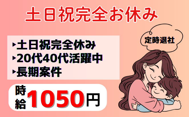 職種/仕事内容 | 仕事内容 【仕事内容】 ・ゴム製品の外観検査 ・不良個所の修正作業 ※重量物の取り扱いは一切ありません! ※作業は単純でモクモクと集中して行える内容です。 【おすすめポイント】 ○ 資格も経験も一切不要!未経験の方も大歓迎! ○ 日勤専属で土日祝休み!プライベートとの両立も可能! ○ 現場には20~40代の主婦さんが多数活躍中!子育て世代にも理解ある環境です。 ○ 嬉しい残業なし!家庭や趣味の時間をしっかり確保できます。 ○ マイカー通勤OK!通いやすい職場です。 【ここがポイント】 ・未経験からスタートできる工場内軽作業! ・日勤専属で生活リズムも安定! ・プライベート充実&家庭との両立が可能! ・綺麗な職場で安心して働ける環境! ・離職率が低く、定着率の良い職場! 【待遇】 ・社会保険完備 ・交通費規定支給(上限15,000円/月) ・制服貸与 ・マイカー通勤OK ・各種福利厚生あり ・プライバシーマーク取得済 ・面接時マスク着用/リモート面接OK 【こんな方にオススメ】 ・モクモク作業が得意な方 ・プライベートと両立したい方 ・家庭や子育てと両立したい方 ・工場勤務や製造業に興味がある方 ・未経験から新しい仕事にチャレンジしたい方 【ここもチェック!】 ◇未経験スタート多数 ◇ブランクOK ◇20代~40代活躍中 ◇週4日以上OK ◇残業なし ◇長期安定 ◇家庭都合休OK 【勤務地・応募】 勤務地:岩瀬郡鏡石町 応募:お気軽にお問合せください! 株式会社NCI 白河支店 〒961-0908 福島県白河市大手町12-1 駅前田部井ビル2F 電話番号:0120-744-555(通話無料) ※「求人サイトを見て」とお伝えいただくとスムーズです。 |