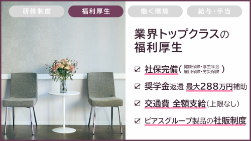 待遇・福利厚生 | 【保険制度】 雇用保険、労災保険、健康保険、厚生年金 【福利厚生】 待遇・福利厚生 【福利厚生】 ■社会保険完備 (健康保険・厚生年金・ 雇用保険・労災保険) ■交通費全額支給(上限なし) ■残業代全額支給(上限なし) ■奨学金返還支援制度 (完済まで毎月返還額の80%を 会社が代理返還します) ■社割あり └ピアスグループのコスメ製品が 特別価格で購入可 ■入社時に転居が必要な方向け: 転居費用20万・住宅補助5年間負担 (規定あり) ■会員制サービスあり └リゾートホテル利用・映画観賞券割引など ■百貨店勤務の場合、社食利用可 ■健康診断・インフルエンザ予防接種 (全額会社負担) ■育児サポートあり └産休・育休取得実績あり └育児短時間制度(ママさん多数活用中!) └産休育休後からの復帰実績: 24年度 1名、23年度 5名、 22年度 5名、20年度 4名 ■介護休業 ■慶弔見舞金 (結婚・出産・子女入学祝い金・ 傷病・災害見舞金など) ■どこにも負けない自慢の “育てる”研修あり └ピアスグループ共通教育 (オンライン受講4日・対面受講2日) └アナスタシア ミアレ技術研修 (対面3週間)※新卒の方は4週間 └店舗OJT(数日間) ■資格取得支援あり └管理美容師免許(会社負担) ■企業年金基金 ■異動希望制度 ■働き方相談窓口 ■ハッピーリターン制度 (退職者の再雇用制度) ■制服貸与 ■ピアスOK ■髪色自由(12トーンまでOK) ■ネイルOK(衛生面のため、 長さの指定はございます) 《長く働いていただけるように 以下の制度も整えています》 ・立ち仕事なし(椅子に座って施術します) ・腰痛対策の冊子配布 ・手荒れ対策として、 ビニール製の手袋をはめて施術するため 基本的に手荒れはありません ・必須のマスクは個人負担はなく、 会社が支給いたします |
