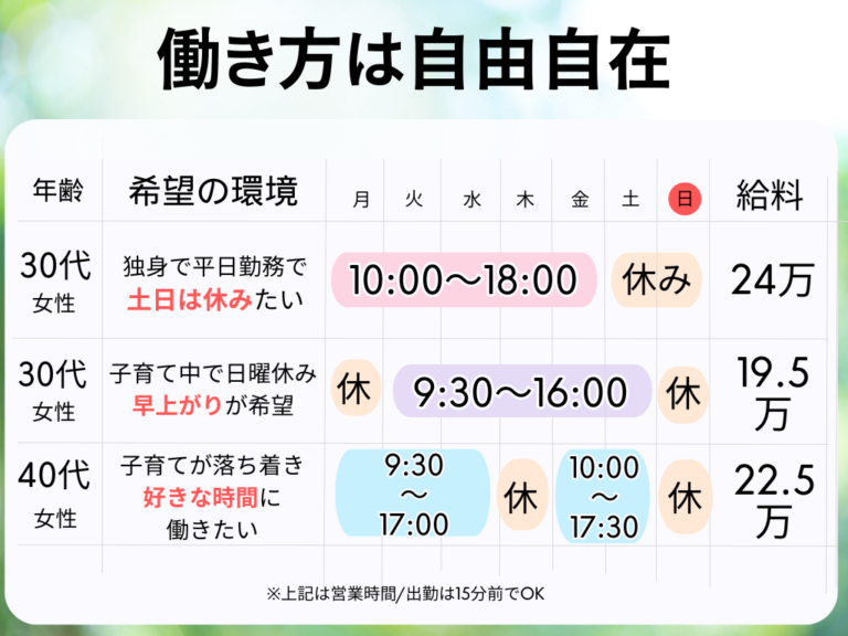 職場環境・雰囲気 | 職場環境 30代・40代が活躍中!カット・白髪染め・縮毛矯正がメイン。フレックススタイルで予約がない日は出勤不要。指名・ノルマなしでストレスなく働けます。土日休みOK、自由にシフト調整可能。家庭と両立しながら無理なく美容師復帰したい方におすすめ! 喫煙所:なし(敷地内全て禁煙) |