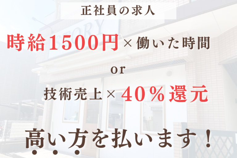 待遇・福利厚生 | 【保険制度】 雇用保険、労災保険、健康保険、厚生年金 【福利厚生】 待遇・福利厚生 【福利厚生】 時給制(1,500円)と歩合制(40%)の高い方を支給) 交通費支給(上限あり) 社会保険完備(週20時間以上勤務で加入可) 完全予約制で効率よく働けるフレックス制度 施術時の手荒れ防止対策あり(低刺激の薬剤を使用) 研修制度あり(ブランクがある方も安心) 半個室の施術スペースで働きやすい環境 希望シフト制(土日休み可) |