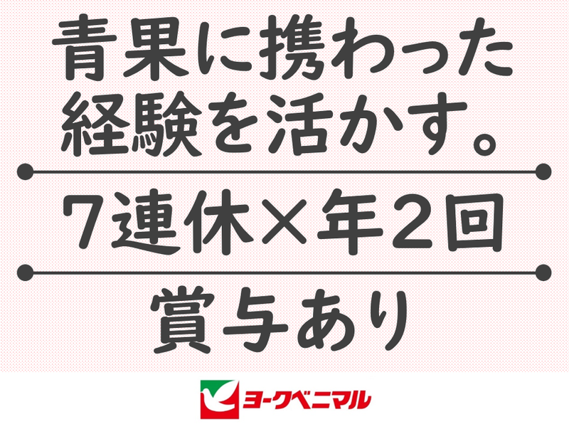職種/仕事内容 | 仕事内容 *‥‥求人のおすすめポイント‥‥* ■裁量権が大きく、これまでの経験を活かせる ■幅広いキャリアパスあり ■月9〜10日休+年2回の7連休あり! ■平均勤続年数17年の安定企業で、長く安心して働けます ✅【お仕事内容】  ̄v ̄ ̄ ̄ ̄ ̄ ̄ ̄ ̄ 生鮮部門(青果)のお仕事です。 具体的には、 ・商品の加工 ・商品仕入れ ・品質保持 ・売場管理 ・商品の陳列 ・売り場作り など 入社後の流れ ✅【入社後の流れ】  ̄v ̄ ̄ ̄ ̄ ̄ ̄ ̄ ̄ まずは売場担当からスタート! 部門ごとの研修を受けたあと、正式に店舗へ配属されます。 ✅【 キャリアプラン】  ̄v ̄ ̄ ̄ ̄ ̄ ̄ ̄ ̄ あなたの成長に合わせて、選べる2つの道! ▽店舗キャリア 担当 → マネージャー → 副店長 → 店長 → 役員職 ▽本部キャリア 本部スタッフ → 統括マネージャー → 本部役員職 ✅【弊社について】  ̄v ̄ ̄ ̄ ̄ ̄ ̄ ̄ ̄ 株式会社ヨークベニマルは、福島県郡山市に本社を置く総合スーパーマーケットです。 1947年の創業以来、福島・宮城・山形・栃木・茨城の5県を中心に247店舗を展開し、地域に根ざした店舗運営を行っています。 主に生鮮食品や惣菜、日用品、衣料品などを取り扱い、「地域のお客様の毎日のくらしをより豊かに楽しく便利にする」ことを理念に掲げ、商品力・情報力・サービス力を活かした店舗づくりに注力しています。 また、平均勤続年数は17年と定着率が高く、社員一人ひとりのキャリア支援や働きやすい環境づくりにも力を入れています。 |