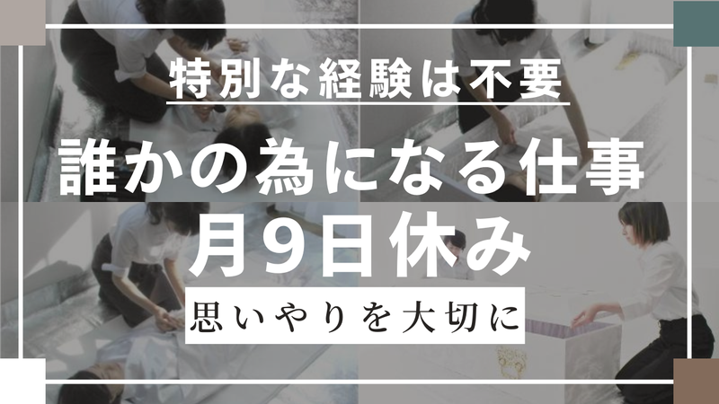 職種/仕事内容 | 仕事内容 故人様の最期を温かく彩る 「おくりびと」。 相手を思いやる気持ち・ 人に寄り添う心があれば大丈夫ですよ。 *** 【仕事内容】 ご家族様とお話ししながら、ご希望に合わせ 故人様にお化粧を施しお棺に納めたり、 湯灌(入浴)を行います。 生前の面影を取り戻し、 美しい姿で旅立っていただくためのお仕事。 お支度の際には、故人様が どのようなものを好まれていたか、 どんな化粧や服装がお好きだったかなど、 人物像をしっかりお伺いする事が大切です。 お話を聞くことで、 お支度の方向性が明確になっていきます。 ※故人様の着替えをする際、 多少の力(体力)が 必要になる場合もあります。 *** 【 未経験者歓迎!資格不要のお仕事 】 ┈┈┈┈┈┈┈┈┈┈┈┈┈┈┈┈┈┈┈┈ お化粧や湯灌(シャワーで体を清めること) などの作業には、専門的な知識が必要な 場合もありますが心配しなくても大丈夫。 チームで補い合いながら、 ゆっくりと慣れていきましょう。 また、湯灌、お化粧、旅支度では ご家族様にも同席していただいてます。 「最後まで見送ってあげたい」 その思いを大切にし、寄り添いながら ご希望を叶えていきましょう。 特別な経験や技術よりも、 私たちは「気持ち」を大切にしています。 ご家族様に寄り添い、 時には生前の思い出話をしながら、 旅立ちの支度を進めることが多くある為、 介護・接客・営業経験のある方、 コミュニケーションを大切にできる方は すぐに溶け込めるお仕事ですよ。 優しい気持ちで 相手の立場に立つことができれば、 自然と知識は身に付きます。 *** 【私たちの取り組み】 ┈┈┈┈┈┈┈┈┈┈┈ エンゼルケアでは、ご家族の方に 湯灌(体を清めること)やご納棺にまで 参加していただき、ご一緒に故人様の 身支度を整えていただきます。 それは後悔のない お別れをしていただきたいから。 最後に過ごした時間は、 残された方の心にいつまでも大切に残ります。 ご家族の方々が、 また前を向いていけるように、 私たちの存在があるんです。 ほかにも疑問や不安があると思いますので ご希望であれば、ぜひ見学にお越しください。 故人様との思い出が 自然と蘇るようなひとときを あなたの手で創っていきましょう。 *** 【働きやすさを1番に。強みを活かせます!】 ┈┈┈┈┈┈┈┈┈┈┈┈┈┈┈┈┈┈┈┈ 現場をメインで管轄しているのは 女性社員の2名。 他スタッフのさまざまな意見を 柔軟に聞き入れて 働きやすい職場づくりを進めています。 たとえば、接客経験者にはヒアリングを 手先が器用な方には お化粧をメインで任せるなど 適性や希望に合わせた 割り振りを行っています。 会社にとって、 頑張ってくれているスタッフが 気持ちよく働けることが一番大事。 こうした姿勢が定着率にも繋がっており 長く続けているスタッフもいるほどの 居心地のよさが魅力です。 |