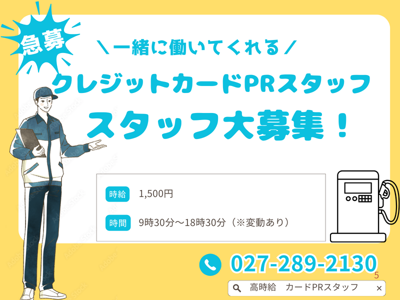 職種/仕事内容 | 仕事内容 \お客様との会話が中心!接客好きな方にピッタリ!/ 大手ガソリンスタンドで、 クレジットカードや会員カードのご案内スタッフとして活躍しませんか☆ ▼お仕事内容 ご来店されたお客様へ、 給油がお得になる会員カードをご案内していただきます! わかりやすく丁寧にご案内できればOK! ご入会時にはタブレットを使ってお客様ご自身に情報を入力していただくので、 サポートをお願いいたします♪ - ▼ここがポイント! ✓ 経験を活かせる♪ →PRスタッフ・接客経験者、スキルを活かすことができます♪ ✓ 未経験スタートもOK! →誰もが最初は初心者です! 「接客好き」というあなたの強みを活かしましょう◎ ✓ 充実したサポート体制 →事前に研修を行うのと、 勤務初日は弊社スタッフが実際に現地でサポートいたします♪ ✓ やりがいを実感できる♪ →獲得数に応じて昇給のチャンスあり!(実績あり) 実際に収入UPしているスタッフも多数います★ ✓ 若干名のみの募集! →ご応募はお早めに♪ - 少しでも気になった方、お問合せも受け付けております! 採用担当:田下・小野宛て 小野直通(女性担当):090-8505-9472 田下直通(男性担当):070-6463-7848 ぐんま支社TEL:027-289-2130 ※ 対応可能時間:月~土曜日/9:00~18:00 お気軽にご応募・ご連絡ください♪ |