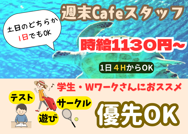 職種/仕事内容 | 仕事内容 土日祝のカフェスタッフ大募集! ◎土曜又は日曜のどちらかだけでもOK ◎学校の都合などで入れない週(週0)があっても前もって言って頂ければ大丈夫ですよ! ◎平日希望も相談OK ◎長期できる方大歓迎 ◎3月末までの短期もOK ◎毎年、春・夏・冬休み・GWだけのスポットで入って頂ける方も大歓迎 ◎バイトデビューもOK! 「イルカカレー」「カワウソワッフル」 「チンアナゴチュロス」「イルカソフト」 など、海の生き物をイメージした 可愛いフードやドリンクを販売する 人気水族館で働きませんか! むずかしい業務は一切なし! ・券売機だからオーダーとりもレジもなし ・レジのある店舗でもタブレット使用だからスマホ感覚で簡単にこなせますよ♪ ・お料理の配膳はなし♪お渡しするだけ ・キッチンでの調理補助・盛り付けなどもお願いしますね まずは笑顔でお客様をお迎えできればOK! ★食事補助があるから節約さんにも嬉しい♪ ~~~~~~~~~~~~~~~~~~~ かわいい海の生き物の近くで働こう! 「キッチンせとうち」 「オリーブ」 「pearlcafe」 3店舗で働けるようになれば時給アップ! 基本から丁寧にお教えします(^^) ー 学生・主婦・フリーターさん、 20代・30代・40代まで 幅広い年代が活躍中!! 忙しい日もありますが、 みんなで助け合いながら 笑顔で乗り切っています◎ ================= 応募のきっかけは何でもOK! ================= *水族館で働くのが楽しそう! *水族館や海の生き物が好き! *前に来た時にメニューが可愛かった! *実際に食べておいしかった! *家が近くて通いやすい! *ちょっとレア感もあって自慢できそう! などいろんな理由で働いている スタッフが多数在籍中♪ 2Fの「せとうちデッキ」からの眺めは最高! きっと “良い気分” で働けるはず☆ |