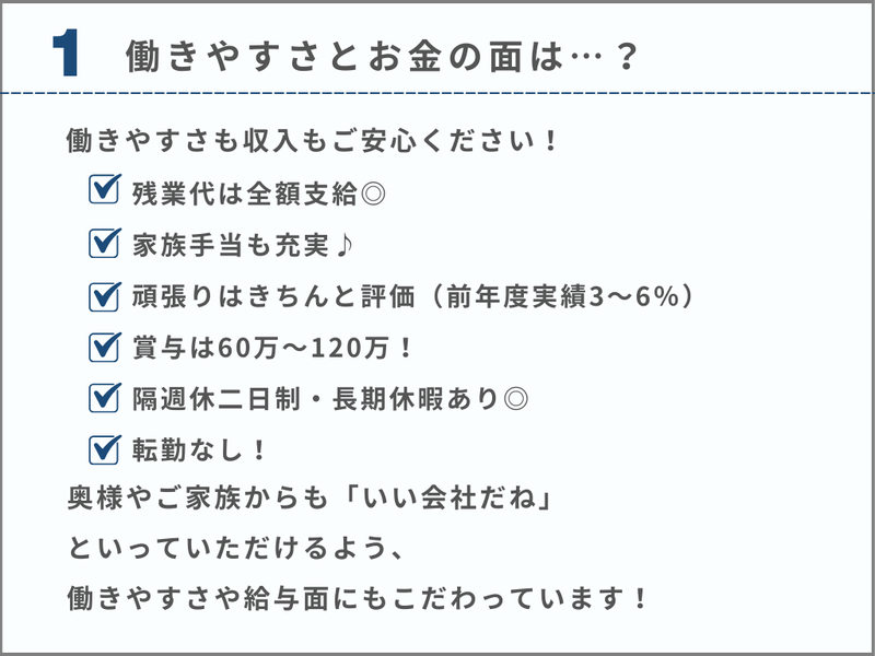 待遇・福利厚生 | 【保険制度】 雇用保険、労災保険、健康保険、厚生年金 【福利厚生】 待遇・福利厚生 【福利厚生】 【福利厚生】 ■転勤なし&マイカー通勤OK ♪ ─────────────── ・無料駐車場完備で通勤ラクラク ・転勤ナシ!地元で長く安心して働けます◎ ・交通費支給(月上限31,600円) ■安心して長く働けるサポート制度 ✨ ─────────────── ・社会保険完備(雇用・労災・健康) ・退職金制度あり ・健康診断ありで体調管理もバッチリ ■昇給・賞与で頑張りをしっかり評価! ─────────────── ・昇給:前年度実績 3~6%/年 ・賞与:年2回/計60万~120万円(前年度実績) ・資格取得支援制度あり(受験費用会社負担) ・時間外・休日出勤手当も全額支給 ・年2回の賞与時に慰労会あり(自由参加) ■ライフスタイルも応援 ─────────────── ・有給休暇は「授業参観」や「家族旅行」など自由に取得OK ・年間休日は日曜休み+隔週土曜休み+長期休暇でリフレッシュ可能 ・子育て世代も働きやすい環境 |