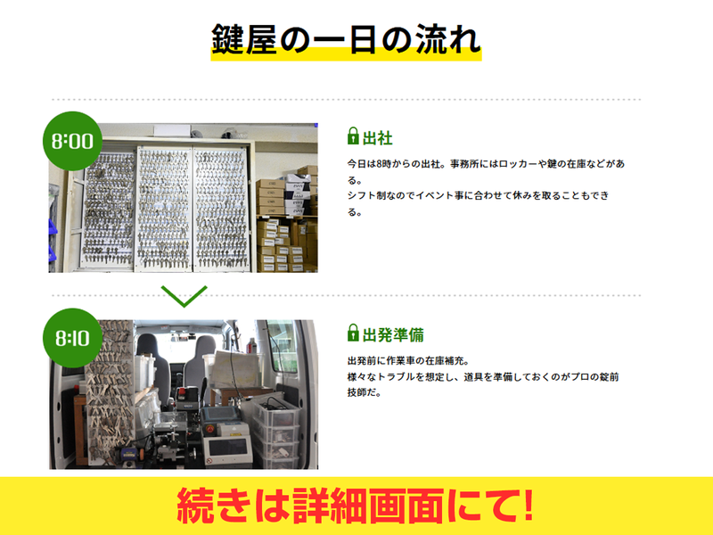 職種/仕事内容 | 仕事内容 「鍵がなくて家に入れない…」そんなお客様のもとへ駆けつけ、鍵を開けたり作ったりする仕事。 平均月収は45万円。たとえばシンプルな住宅の鍵開けは、1件につき安くても1万以上。車の鍵製作は6万弱、鍵の取り付けは8万以上。ピッキングしにくい『ディンプルキー』の鍵開けは、何と10万超え。これだけで計25万円以上にもなります。 依頼は1日平均3~4件、多くて10件。コツコツ応じて着実に稼げるため、大半の社員が入社半年~1年で月収45万円に達します。 入社後は専門学校(受講料無料)での座学と、先輩の指導があるため安心。技術を磨けば対応できる種類が増え、作業時間も短縮でき、より多くの依頼をこなせるようになります。稼ぐために心をすり減らすのは、もうやめにしませんか? 【具体的な仕事内容】 ▼依頼が入る 「鍵をなくしてしまった」といった個人のお客様からの依頼や、「入退去に伴って鍵を交換したい」といったマンションの大家さんからの依頼が中心。コールセンタースタッフが受けつけ、カギサポ24のスタッフに連絡が入ります。 ▼現場で作業をする お客様のもとへ社用車で駆けつけ、専門の道具を使って交換・開錠をします。家の鍵をはじめ、ベランダ、金庫、車、車のエンジンの鍵など、ありとあらゆる鍵に関するトラブルを扱います。 【仕事のポイント!】 ◎各所から必要とされている仕事です。 一般のお客様だけでなく、お年寄りの安否確認や、警察からの依頼(強制捜査)で開錠をすることもあります。官公庁や大手有名企業とも取引実績あり。各警察署から感謝状も多数いただいています。 |