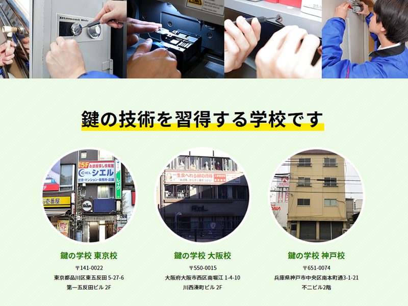 試用期間 | 試用期間あり 試用・研修期間:3か月 試用・研修期間の条件:本採用と同じ ●学校通学(2週間程度) └まずは弊社の運営する「鍵の学校」に入学いただき、鍵に関する様々な特殊技術を学んでいただきます。 ●現場同行(1週間程度) └研修の最後は実際に配属事業所の先輩社員と一緒に現場を回って鍵のトラブルを解決していただきます。 |