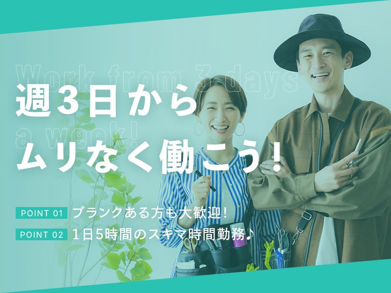 職種/仕事内容 | 仕事内容 *~*~*~*~*~*~*~*~*~*~*~*~* 「育児で職場に迷惑かけたくない…」 「ブランクがあるから不安…」 「家庭があっても活躍できるかな…」 そんな方もご安心を◎ 主婦さんも多数活躍中のサロンです♪ *~*~*~*~*~*~*~*~*~*~*~*~* \\ こんなにある働きやすさ // ★週3日、1日5時間から勤務OK ★駅近1分以内、通勤ラクラク ★ブランクある方も大歓迎 ★サポート体制完備 ★もちろん交通費支給あり♪ ⇩ 無理なく働けるサロンでの仕事  ̄ ̄V ̄ ̄ ̄ ̄ ̄ ̄ ̄ ̄ ̄ ̄ ̄ ̄ ̄ 品のある落ち着いた空間のサロンで、 スタイリスト業務をお任せします! 1|髪質改善が得意 ⌒⌒⌒⌒⌒⌒⌒⌒⌒⌒⌒⌒⌒⌒ 一人ひとりの髪質に合ったトリートメントが大人気! 超音波アイロンを導入しており、リピートで来店してくださる方も多数♪ ★全国で1%の美容室のみ取り扱い可能な「バイカルテトリートメント」あり! 2|大人女性が多数来店 ⌒⌒⌒⌒⌒⌒⌒⌒⌒⌒⌒⌒⌒⌒ 落ち着いたお客様が多いため、 スタッフもリラックスして施術を行うことができます♪ ≪ 上場企業傘下の安定サロンです ≫ 産休や育休、有休といった制度が整備されていることはもちろん、 充実のサポート体制も完備! ブランクがある方も安心して飛び込んできてくださいね✨ |