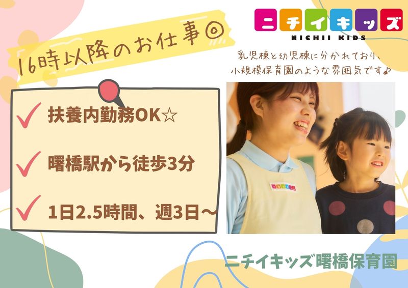 職場環境・雰囲気 | 【Point オススメポイント】 ・曙橋駅から徒歩3分!通いやすさ抜群です♪ ・都会の中心に位置していながら、園の周辺には自然豊かな公園もたくさんあります。 ・園は乳児・幼児の二棟に分かれており、小規模保育園のような雰囲気もあります。 ・休み希望は通りやすく、プライベートも充実させることができます。 ・勤務日、勤務時間は相談可能です。書類の業務はほぼありません 【Message 採用担当者より】 【園長からのコメント】 ニチイキッズ曙橋保育園は65名定員の乳児棟・幼児棟からなる認可保育園です。 乳児棟は0歳児から2歳児、幼児棟は3歳児から5歳児の園児が通っています。 2つあるからこそ職員同士は連携し合い、解決方法を一緒に考えています。 子どもたちもとっても明るく元気!そんな笑顔から職員はパワーをもらっています。 「風通しがよく、子ども達にとって」を第一に考えて、園作りを行っています。 【おすすめポイント】 ニチイキッズは全国に約350カ所の保育園や子育て支援施設を展開しています。 私たちニチイキッズの保育理念は「おもいっきり遊ぶ。 おもいっきり学ぶ。」 子どもたちが”おもいっきり”のびのびと活動できる環境や活動内容を 先生たちみんなで考え作る保育園となっております。 また、ニチイキッズのもう一つの取り組みとして、”おもいっきり給食”があります。 基本的には3大アレルゲン【卵・小麦・牛乳】を使用しない献立となっております♪ アレルギーのある子もお友達と一緒に楽しくお給食を食べることができます! ニチイキッズの”おもいっきり”を気軽に体験しに来ませんか? 園見学でお待ちしています! 【応募方法】 「選考」を希望される方、「まずは園見学から」という方もお気軽に【応募する】ボタンからご応募ください。 採用担当より、面接・園見学日程調整をさせていただきます。 面接は、予約枠からご希望の日程で予約も可能です!(オンライン面接も実施中) 【応募後のプロセス】 ・当日は、履歴書・職務経歴書・資格証をご持参ください。 【お問い合わせ先】 関東第二支部 人材課 TEL:03-5909-3161(月曜~金曜 9:00~17:15) |