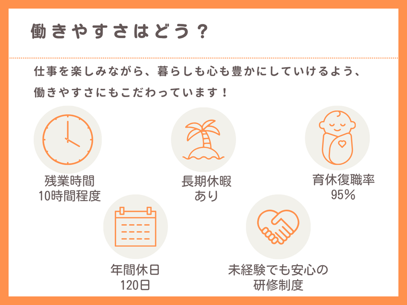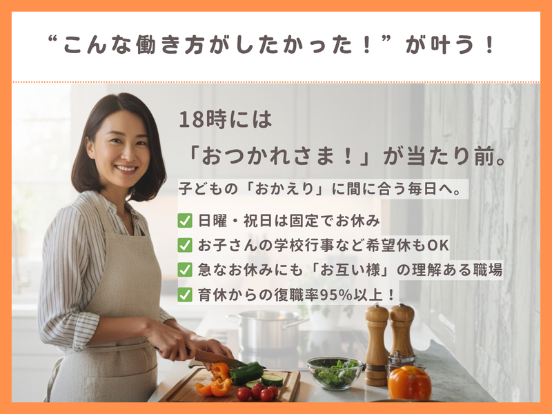 休日休暇 | 休日休暇 ◆休業日 日曜日・祝日 ◆休暇 ・夏季休暇(3日) ・年末年始休暇 ・年次有給休暇 ・慶弔休暇 ・産前・産後休暇、育児休業 (取得実績多数/復職率95%以上!) ■ 家庭との両立を全力で応援します ✨ ┈┈┈┈┈┈┈┈┈┈┈┈┈┈┈┈┈┈ 子育て中のスタッフも多数活躍中! ライフステージの変化にも柔軟に対応できる 体制が整っています。 ✅ 日曜・祝日は必ずお休み 週末の予定が立てやすく、 家族との時間も大切にできます。 ✅ お休みの希望も通りやすい お子さんの学校行事や家庭の用事など、 シフトは遠慮なくご相談ください。 タイミングが合えば3~4連休の取得も可能です。 ✅ 育休からの復職率95%以上! 産休・育休の取得実績が豊富で、 ほとんどの先輩が職場に復帰しています。 お子さんが6歳になるまで時短勤務も可能。 子育てに理解のある職場だから、 安心して長くキャリアを築けます。 |