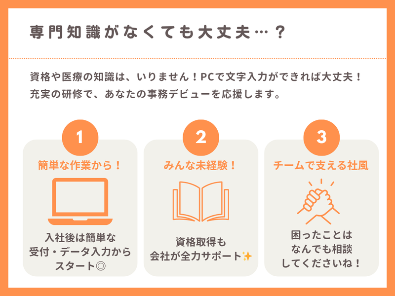 対象となる方 | 求めている人材 \\未経験・無資格OK!// 〈必須条件〉 ・高卒以上 ・基本的なPCスキル (文字入力ができるレベル) ・普通自動車運転免許(AT限定可) ※業務で車を運転することもあるため、 日常的に運転している方を想定しています。 〈歓迎条件〉 ・医療事務または調剤事務の経験 ・医療事務関連の資格 ・接客や販売など、 人と接する仕事の経験 〈求める人物像〉 ・未経験から専門知識を身につけたい方 ・人と話すことが好きで、 丁寧な対応ができる方 ・安定した環境で 腰を据えて長く働きたい方 ・チームワークを大切にできる方 ⭐スタッフの半数が未経験スタート⭐ 分からないことは先輩が丁寧に教えてくれるので、 安心して飛び込んでくださいね♪ まずはお気軽にご応募ください✨ |