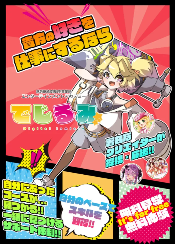 職種/仕事内容 | 仕事内容 【お仕事内容】 ・障がいのある方へのイラスト指導 ・動画編集指導 ・グラフィック指導 ・記録業務 ・送迎業務有。 各ソフトの操作についての指導がメインになります。 テレビでも取り上げられた「でじるみ」が高崎市にも2025年3月新規OPEN! イラスト、グラフィックデザインや動画編集等サブカルチャーの技術を活用し、社会で活躍できる利用者さんをどんどん増やしていく、今までにない就労支援事業所で一緒にお仕事をしていただける方を募集します。 【一緒に働けるのを楽しみにしています!】 ◎新人さんに優しい職場環境! 当社は新人教育に力を入れている職場です! 入社したスタッフさんがしっかりと業務内容になれ独り立ちできるように先輩スタッフがイチから教育サポートする体制が整っているので、安心してご応募くださいね♪ |