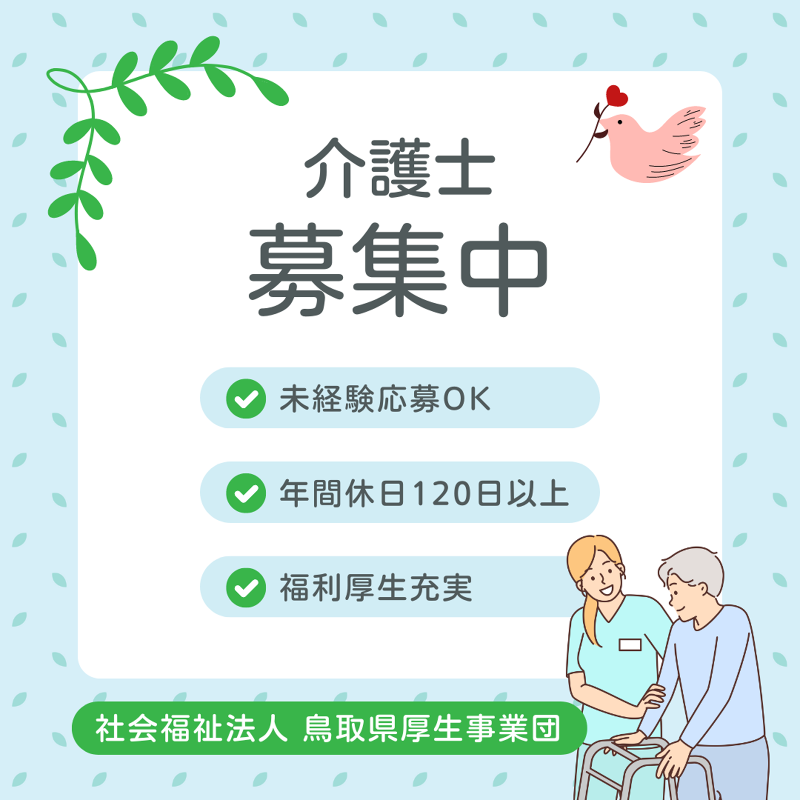 その他 | その他: <企業紹介> 〜まごころで、笑顔あふれる 福祉の輪〜 障がい者支援施設、特別養護老人ホーム、 その他、障がい者支援センターなどの 福祉施設や事業所を県内で幅広く運営しております。 2020年には設立50年を迎え、 これからも福祉を必要とされる方の力となり、 愛される法人として歩んでいけたらと思います。 HP:https://www.tottori-kousei.jp/ -------------------------------- [申込方法] (1)次の書類を期限までに下記宛てに提出してください。(郵送可) ①受験申込書 ②履歴書 ※写真添付 ③社会福祉士、介護福祉士、精神保健福祉士又は社会福祉士、介護福祉士、精神保健福祉士又は介護支援専門員の資格をお持ちの方は、 その資格証の写し ※郵送の場合、万が一未着等の事故が発生しても、受付期間内に郵便又は信書便で申し込んだ ことが明確に確認できない場合は、理由の如何を問わず受理しません。(郵便局又は信書便 事業者で交付される受領証等は、当法人からの受験依頼文書が届くまで大切に保管しておい てください。) ※受付期間内に郵便又は信書便で申し込んだ場合であっても、切手料金不足等により申込者に 返送され、結果的に受付期間外の申込みとなった場合など、申込者の責による申込みの遅延 等の場合、理由の如何を問わず受理しません。 ※応募書類は、採用選考に係る業務以外には使用いたしませんので返却しません。 ※本募集案内、受験申込書及び職務経歴書の様式は当法人のホームページからダウンロードで きます。ご希望により郵送又は別途お渡ししますので、ご連絡ください。 受験申込書提出先 〒 689-0201 鳥取市伏野2259-43 社会福祉法人鳥取県厚生事業団 人事課採用担当 (2)受付期間 令和6年9月17日(火)~令和6年10月15日(火) 午後5時必着 ※持参の場合は、午前9時から午後5時まで (3)受験通知書 受験通知文書を受付期間終了後送付します。 【試験内容】 (1)一次試験 ①基礎能力検査・性格検査:SPI3-G(WEBテスティング) ②作文試験:1200字以内(作文テーマは当日配布の作文用紙に記載) (2)二次試験(一次試験合格者のみ) 面接試験(個別面接) [試験日時・会場] (1)一次試験 【作文試験】 日 時:令和6年10月22日(火)午前 会 場 湯梨浜はごろも苑 はごろもホール(湯梨浜町上浅津 407 Tel.0858-41-1701) 【基礎能力検査・性格検査】SPI3-G(WEBテスティング) 日 時:令和6年10月23日(水)~10月27日(日) ※上記期間内に自宅等のパソコンで受験(インターネット環境が必要) (2)二次試験(一次試験合格者のみ) 日 時 令和6年11月13日(水) 会 場 ふしの白寿苑 会議室(鳥取市伏野 1771-36 Tel.0857-59-0108) ※時間等の詳細は、1次試験合格通知文書に記載します。 合格発表 【第一次試験結果】 11月7日(木)までに受験者全員に郵送で通知します。 【第二次試験結果】 11月20日(水)までに全員に通知を郵送します。 ※合否に関する電話等による問い合わせはご遠慮ください。 //////////////////////////////////////// 《電話でのお問い合わせ》 0857-59-6033( 担当:採用係 )までお問合わせください。 受付時間 8:30〜17:00 //////////////////////////////////////// 雇用形態: 正社員 給与・報酬: 175,400円 - 279,400円 月給 平均所定労働時間(1か月当たり): 160時間 |