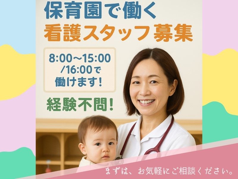 職種/仕事内容 | 仕事内容 【保育園看護師/派遣】週5日×日勤固定◎15時までの時短勤務もOK!園児の健康管理・0歳児補助あり|新潟市東区 - ### ポイント * 勤務時間固定|**8:00~16:00または15:00までの短時間もOK!** * 土曜勤務ナシ・**平日のみも歓迎!** * 保育園未経験OK|**子育て経験も活かせます!** * 派遣スタッフとして、家庭との両立や働き方に配慮◎ - ### 勤務先情報 * 勤務地:新潟市東区・こども園 * 園児定員:120名(0~5歳) * 園庭が広く、自然との関わりを大切にする保育園です * バイパス至近で通勤しやすい立地です - ### お仕事内容(派遣看護師) * 園児の健康観察・体調不良時やケガへの対応 * 内科検診・歯科検診の準備および介助 * 必要に応じて保護者への連絡・報告 * 0歳児クラスでの保育補助業務(ミルク、寝かしつけ、見守りなど) ※医療行為はありません(応急処置対応のみ) - ### この求人の魅力 * 時間固定・残業なしで家庭との両立がしやすい * 医療行為はなく、穏やかな園での業務が中心 * 保育補助にも関われて、子どもと関わる喜びを感じられます * 派遣での就業なので、希望に応じた期間や条件で働けます - お気軽にお問い合わせください! - ※仕事No1-9986 まずはお気軽にお問合せください! ★登録時はメールやLINEで履歴書のやりとり可♪履歴書の写真を撮って送るだけでもOK! ★顔写真不要です♪ |
