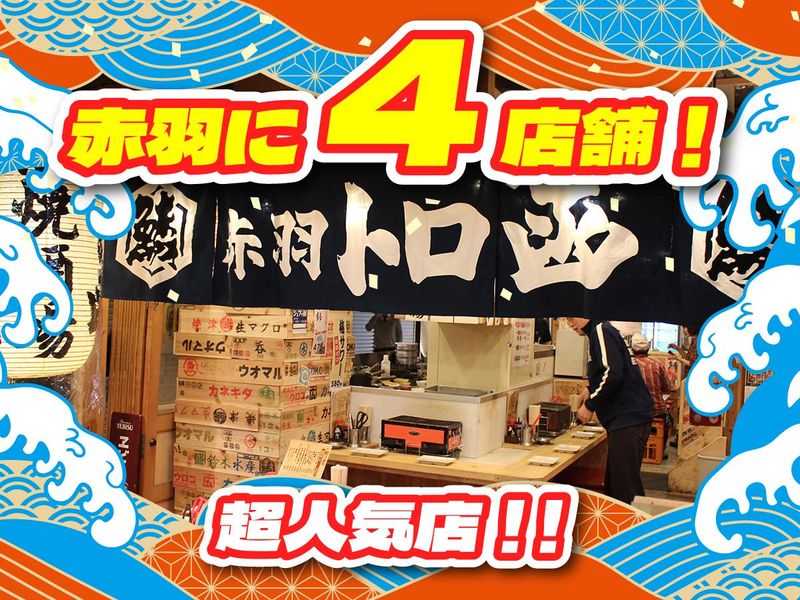 職種/仕事内容 | 仕事内容 \調理経験者歓迎!30~40代活躍中!/ 【赤羽の人気浜焼き居酒屋「トロ函」】 居酒屋・和食等の調理経験者を募集! (飲食店でのキッチン経験があればOK) ”都会の海の家”をコンセプトに、 海鮮浜焼きをメインとした酒場です。 赤羽駅東口に4店舗を展開しています。 いずれの店舗へも行き来する可能性は ありますが、全店が近隣に集中しているので 移動はらくちんです! むしろ違う雰囲気も味わえる楽しみもあり♪ - <働きやすい職場環境です!> ■公休日は月8日確保 ■ディナータイム営業のみ ■ランチ営業、深夜営業はありません ■入社月から全社員に手当支給! 各店の大入り手当+業績手当が (3~7万円)必ず毎月支給されます! 業績次第では更に月収もUP!! - オープンキッチンのお店なので、 厨房にこもってモクモク調理…ではなく、 20代~70代まで幅広いお客様との会話を 楽しみながらお仕事することが可能です! 慣れてきたら、 メニュー開発や店舗運営にも参加可能! 「自分の店を持ちたい」 「経営に興味がある」 など、目標がある方は大歓迎! 家族と過ごす時間も充実させられるし、 将来に向けてステップUPも可能です。 なんといっても超超人気店! 活気にあふれ、人々が行き交う赤羽の街、 従業員とお客様があだ名で呼び合う 地域の交流の場になっています。 お客様の笑顔が、 自身の仕事のモチベーションアップに 繋がるお店です!! |