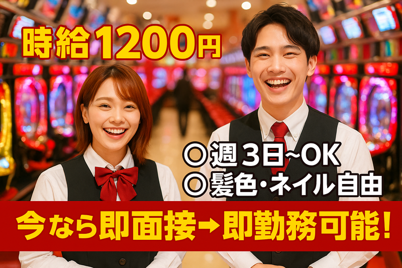 職種/仕事内容 | 仕事内容 来店されたお客様が気持ちよく過ごせるよう、 ホールでのサポート業務をお願いします。 ◆ 箱交換 お客様の呼び出しに対応して、パチンコ玉の入った箱を交換します。 最初は先輩が一緒に回って教えてくれるので安心! ◆ メダル回収 スロットコーナーでのメダル回収・補充を行います。 重たい作業ではなく、コツを覚えればスムーズにできます! ◆ 簡単な清掃 台まわりや通路などの清掃で、キレイで快適な空間を維持します。 ◎「もっと詳しく知りたい」という方には、職場見学も実施中! 実際の雰囲気を見てからスタートできるので安心です♪ ★未経験でも安心のサポート体制 担当SV(スーパーバイザー)が、最初から丁寧にサポート! できることから少しずつ覚えていけばOKです。 分からないことはすぐ聞ける環境なので、初めてでも心配いりません! ★働く仲間・雰囲気 20代・30代のスタッフが中心に、明るく元気な職場です! 友達同士の応募も大歓迎! 「1人で応募が不安…」という方も、安心してスタートできます♪ |