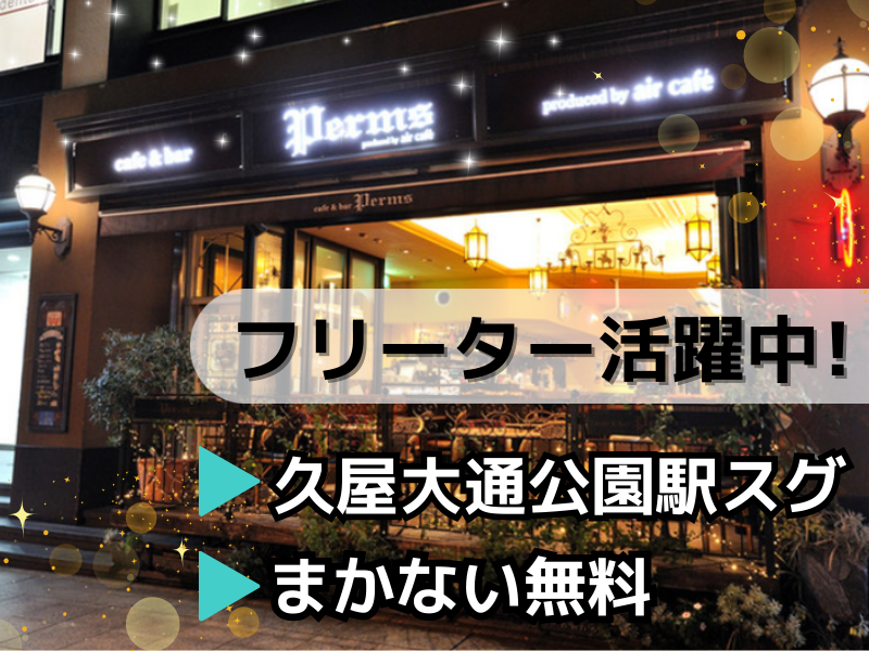 勤務地 | Cafe&Bar Perms 461-0001愛知県名古屋市東区泉1丁目23-26NBN泉ビル 勤務地 地下鉄「久屋大通」駅の1A出口目の前。雨の日でもほぼ濡れずに出勤ができちゃいます◎ 近くには商業施設や百貨店などが多くあるので、ついでにお買い物をしたり、プライベートの予定も入れやすいです♪ |