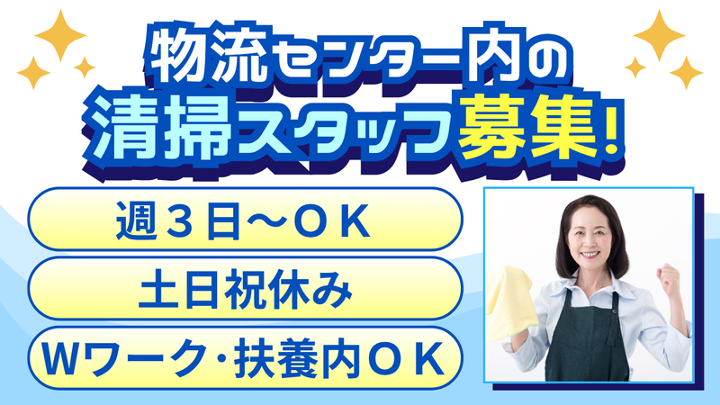 職種/仕事内容 | 仕事内容 ========================= ✨資格・経験・年齢は一切不問!!✨ ========================= 白井市にある物流センター内の 日常清掃スタッフを募集します。 お任せするのは、 廊下・階段・トイレ(男女)などの清掃 拭き掃きが中心で、 機械操作などの難しい作業はありません◎ 「家で掃除をするのが好き」 「体を動かす仕事がいい」 そんな方にピッタリのお仕事です♪ ★未経験の方も大歓迎!  ̄V ̄ ̄ ̄ ̄ ̄ ̄ ̄ ̄ ̄ ̄ 実際に働いているスタッフの多くは、 未経験からスタートした方ばかり。 初めての方も安心して始められるよう、 担当者が一から丁寧にお教えします。 最初は簡単な作業から始めていただき、 徐々に慣れていきましょう♪ ★働きやすい環境です!  ̄V ̄ ̄ ̄ ̄ ̄ ̄ ̄ ̄ ̄ ̄ センター内は広く清潔で、 空調も効いているため、 年中快適に働ける環境です。 1人でコツコツと進める作業が中心なので、 人と話すのが得意でなくても大丈夫。 「静かな環境で自分のペースで働きたい」 という方にもおすすめです◎ また、 ・平日のみ勤務(週3日~OK) ・1日4時間だけ(8:00~12:00) ・土日祝休みで家庭と両立しやすい という働きやすさも魅力。 家事や育児、趣味の時間も大切にしながら、 無理なく続けられる環境です。 扶養内勤務やWワークもOKなので、 生活スタイルに合わせて働けます◎ |