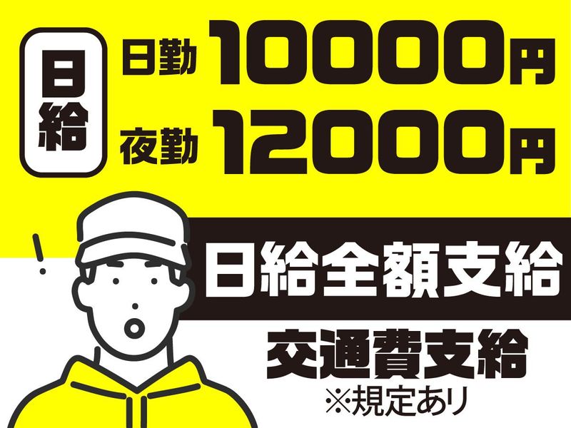 給与 | 日給10,000円以上 給与詳細 基本給:日給 1万円 〜 固定残業代:なし 【一律手当】 全員に一律で支払われる通勤・皆勤・家族手当金額:なし 全員に一律で支払われるその他手当金額:なし 【日勤】1万円~ 【夜勤】1万2000円~ ★早上がりでも全額日給保証!★ ★日払いOKで翌日収入GET!★ 【給与例】 給与例 ■週5日/夜勤のみ ・日給1万2000円×22日 ⇒月収26万4000円 ■週3日/日勤のみ ・日給1万円×12日 ⇒月収12万円 ■週3日/日勤&夜勤 ・日給1万円×6日 + 日給1万2000円×6日 ⇒月収13万2000円 ※上記目安金額となります。 |