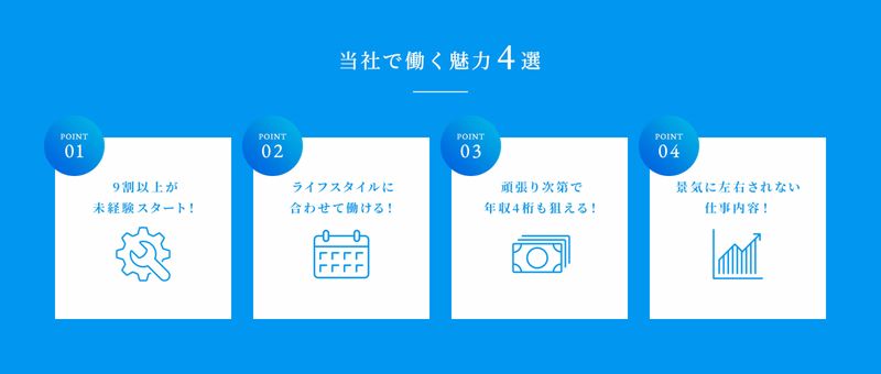 給与 | 月給300,000円~1,200,000円 給与 月給 300,000円~1,200,000円 ※所定労働時間超過分の労働については別途残業代を支給します ※上記は業界経験者の目安です。 未経験は24万~ですが、3年目は平均48万と すぐに稼げるようになります。 ★社員の約25%が年収1,000万超え★ ※入社3年目以降で計算 ★インセンティブ制度あり★ 半年間ごとの売上の40〜60%を、 6ヶ月単位で割って翌年の半年間の給料に反映。 【各種手当】 ●研修手当月4万円 ※入社直後のダイキン工業の研修期間3ヶ月計12万支給 ●賞与あり(年2回) ⇒トータル100,000円支給 ●交通費支給(全額支給) ・家族手当(5,000円/中学3年生までのお子様) ・資格手当(それぞれ毎月5,000円を支給) ⇒電気工事士&第二種冷凍機械責任者 ※入社2年目まで。3年目以降はインセンティブで還元。 ・夜間手当 ⇒頻度:2~3ヶ月に1回程度 ⇒19時以降は手当有 ・早朝手当 ⇒頻度:年に1~2回 ・休日出勤手当 |