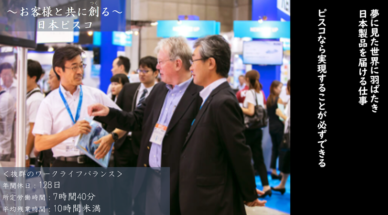 職種/仕事内容 | 仕事内容 \ここがポイント / ====================== ■年間128日休(2025年より)&月平均残業10時間未満 ■賞与4.7ヶ月支給(昨年実績) ■英語力を活かせる! ■将来の海外駐在員候補! ====================== 今回の募集について  ̄ ̄ ̄ ̄ ̄ ̄ ̄ ̄ ̄ ̄ ̄ ̄ ̄ ̄ ̄ ̄ ̄ ̄ 事業拡大による増員 仕事内容について  ̄ ̄ ̄ ̄ ̄ ̄ ̄ ̄ ̄ ̄ ̄ ̄ ̄ ̄ ̄ ̄ ̄ ̄ ・海外現地法人(アメリカ、中国、韓国、台湾、ベトナム、タイ)への赴任を目標とした採用となります。 ・まずは海外業務課にて、海外顧客からの受発注業務や海外現地法人のサポート業務を通じ、自社製品の知識や人脈を構築頂きます(目安3カ月)。その後、国内の営業所にて、知識を活かしつつ営業経験を蓄えて頂いた後に海外赴任を予定しております(目安3年)。 ・赴任後には、海外業務課で得た知識を活かし、現地での市場調査や需要予測等の分析、それに伴っての新規開拓、販売基盤の強化・拡充を目指した営業活動に従事していただきながら、現地責任者クラスの業務を期待しています。 ・海外営業は社長直轄部門であるため、経営の重要な役割を担うことができます。 【研修制度】 研修制度として、新入社員研修・階層別研修などがあります。駐在期間中も必要な階層別研修時には一時帰国し受講して頂きます。 ■仕事の魅力: FA(ファクトリーオートメーション)分野において、空気というクリーンエネルギーを用いた多様な製品群を商材に、お客様のニーズに合わせたソリューションを提案できます。 当社について  ̄ ̄ ̄ ̄ ̄ ̄ ̄ ̄ ̄ ̄ ̄ ̄ ̄ ̄ ̄ ̄ ̄ ̄ ■扱う商品 当社が手掛ける事業は、産業用ロボットの動力源として欠かすことのできない圧縮空気。 当社では圧縮空気を配管するための継手やチューブ、流量や圧力を制御する各種制御機器、その他バルブや真空機器、アクチュエータ等の空気圧機器を独自に開発、製造、販売しています。 取引業界も工作機械をはじめ、半導体、自動車、食品、レジャー、医療、宇宙開発等と大変幅広く、オリジナリティ豊かなピスコ製品は世界中のあらゆる産業界で活躍しています。 ■当社の強み 開発から製造、販売まで一貫して行っています。 さらに徹底した品質管理のもと、組立はもとより、多くの部品を内製しています。 そのため、市場では「高品質なピスコ製品」と評価されています。 私たちは、下請け企業ではなく、自社ブランドとして製品を世に送り続けています。 ■トップメッセージ・ビジョン 当社は、社名の由来となる独自の発想による流体切換法 - PIPE・SLIDE・CHANGE - P.S.C(特許第1300034)流体の切換弁を商品化し、1976年10月に創立しました。創業以来、独自の知恵とお客様の立場に立ったモノづくりを会社経営の基本思想とし、数多くの商品を市場に提供し続けております、現在PISCO商品は国内市場はもとより、海外市場においてもたくさんの取引先にご愛用頂いております。PISCOブランドは信頼に裏付けされた関係ある人々への約束であると考えております。当社は、創業の原点を忘れることなく、謙虚に取引先の声を聞き、その日々多様化するご要望に迅速で柔軟に対応し、今後も一層努力を積み重ね、顧客満足度を向上させるモノづくりに全社員が精進し、PISCOブランドのより良い商品とサービスの提案を続けていきたいと考えております。 ■■■■■■■■会社概要■■■■■■■■ ■設立 1976年10月18日 ■従業員数 530名 ■売上 150億円以上 ■事業内容 空気圧機器の開発・製造・販売 ■資本金 4億8,856万5,000円 ■営業所 東京、仙台、太田、茨城、八王子、川崎、埼玉、名古屋、長野、静岡、金沢、大阪、新大阪、京都、広島、福岡、熊本 ■■■■■■■■■■■■■■■■■■■■ |