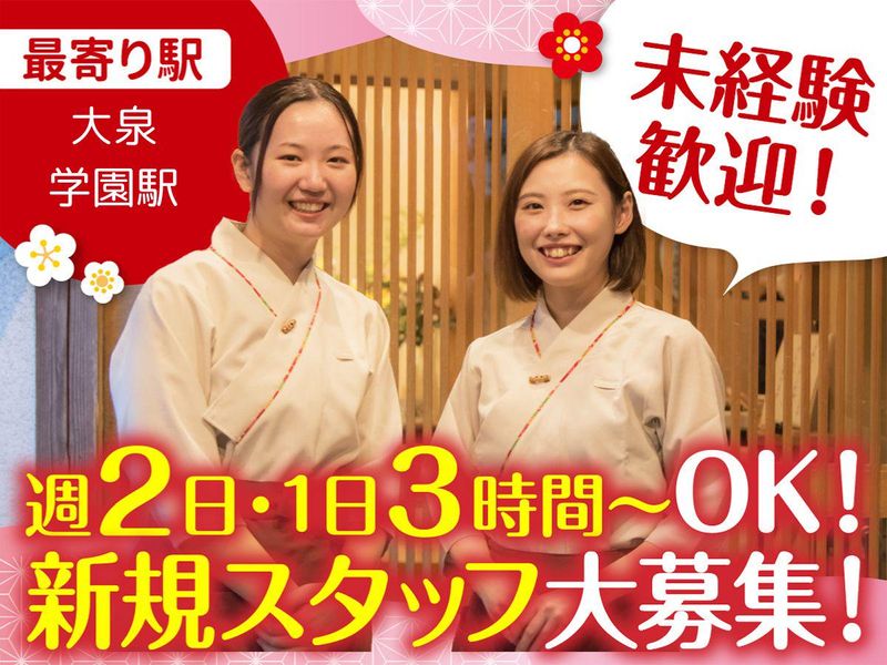 職場環境・雰囲気 | 職場環境 ✨店内は和を重んじた落ち着いた雰囲気 和風な雰囲気が好きな方、 和食が好きな方にオススメです♫ ✨「大泉学園駅」より 直結 駅チカで通勤にも大変便利です♫ 他にも「保谷駅」「石神井公園駅」 「上石神井駅」「武蔵関駅」 などアクセス抜群です! |