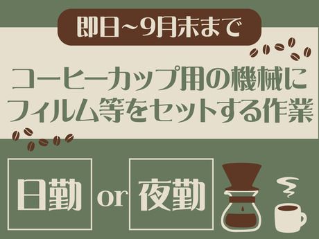職種/仕事内容 | 仕事内容 コーヒーカップ用の機械にフィルム等をセットする作業 \ 「日勤」or「夜勤」選べる!! / ★★即日~9月末までの期間限定★★ 難しい作業なし♪コツコツ&黙々作業◎ コーヒーカップ用の機械にフィルム等をセットするお仕事! (具体的には)  ̄ ̄ ̄ ̄ ̄ ̄ *傷などがないかチェック *指示通りに機械にフィルムなどをセット など 初めての方でも半日あれば覚えられるお仕事! わからないことは先輩staffが 丁寧にサポートするのでご安心下さいね♪ ★☆ 短期・レギュラーワークで稼げる ☆★ ●働き方は自由自在! ●スキマ時間や空いている日を有効活用できる! ●平日だけ、土日だけもOK! ━━━━━━━ ★こんな方に★ ━━━━━━━ ■長期休暇に自由にお金を使いたい! ■週末の飲み会に向けてお金が欲しい ■会話少なめで簡単な仕事が欲しい など ★☆嬉しいメリットを教えてください!☆★ 【1】日払いOK 「急な出費のときに本当に助かる…」 「欲しいものがすぐに買えます♪」 「遊ぶ予定の前にサクッと稼いでます!」 【2】短期OK 「長期休みのときだけ働いてます!」 「次の仕事が決まるまでの"繋ぎ"で」 「季節限定のオシゴトだけ♪」 ★☆ スタッフの声 ☆★ 「家庭と両立して働けています。 子育てが落ち着いたらもう少し シフトを増やしてみようかな!」 「アルバイトをしていたけど 急にシフトに入れなくなって 困っていたときに応募しました!」 みなさん、学校・家庭・他のお仕事など と上手に両立しながら働いていますよ♪ |
