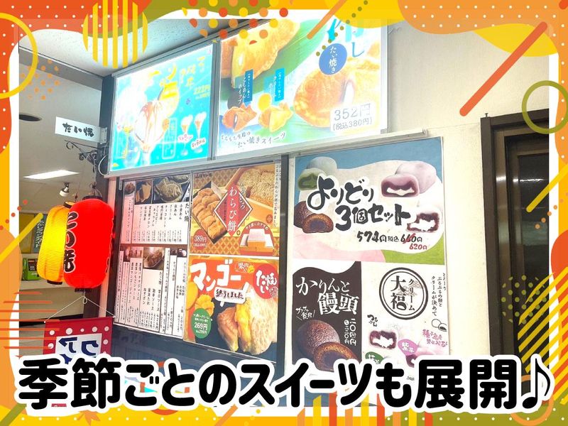 職場環境・雰囲気 | 職場環境 学生アルバイトさん~40代・50代主婦パートさん、女性スタッフ中心に活躍中! 基本は2人体制、忙しい時間や曜日に合わせてスタッフを追加して営業してます。 バイト未経験、接客が初めての方なども活躍中! たい焼きの香りに包まれながら働けますよ♪ 喫煙所:なし(敷地内全て禁煙) |